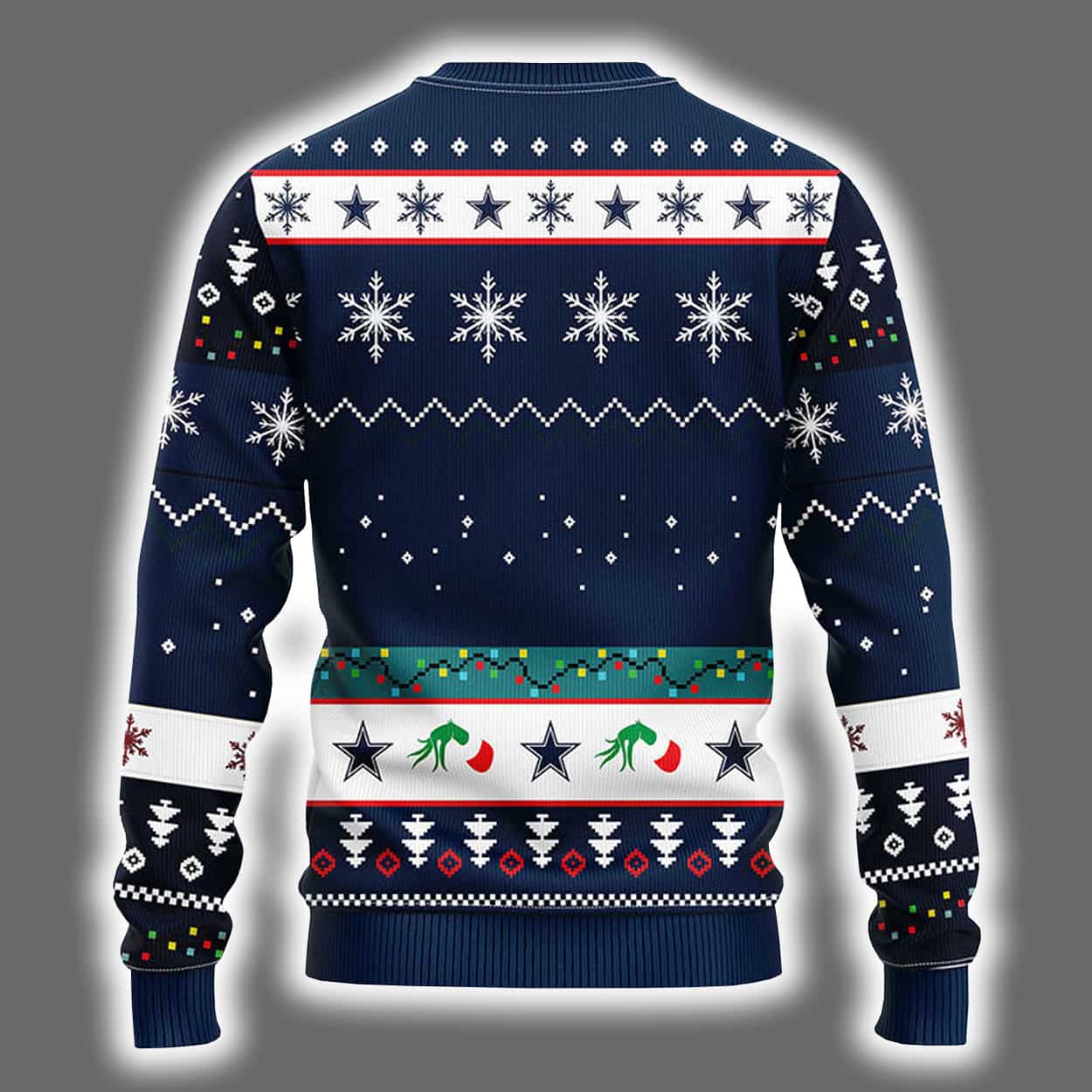 Turn heads and spark laughter at every holiday gathering with this sweater. This vibrant design features the iconic green hand of the Grinch holding a Cowboys logo. Set against a deep blue backdrop sprinkled with snowflakes and stars, the sweater bursts with classic Christmas motifs: candy canes, reindeer, trees, and snowflakes in bold reds, greens, and whites. The back continues the festive vibe with matching patterns, making sure you’re holiday-ready from every angle.