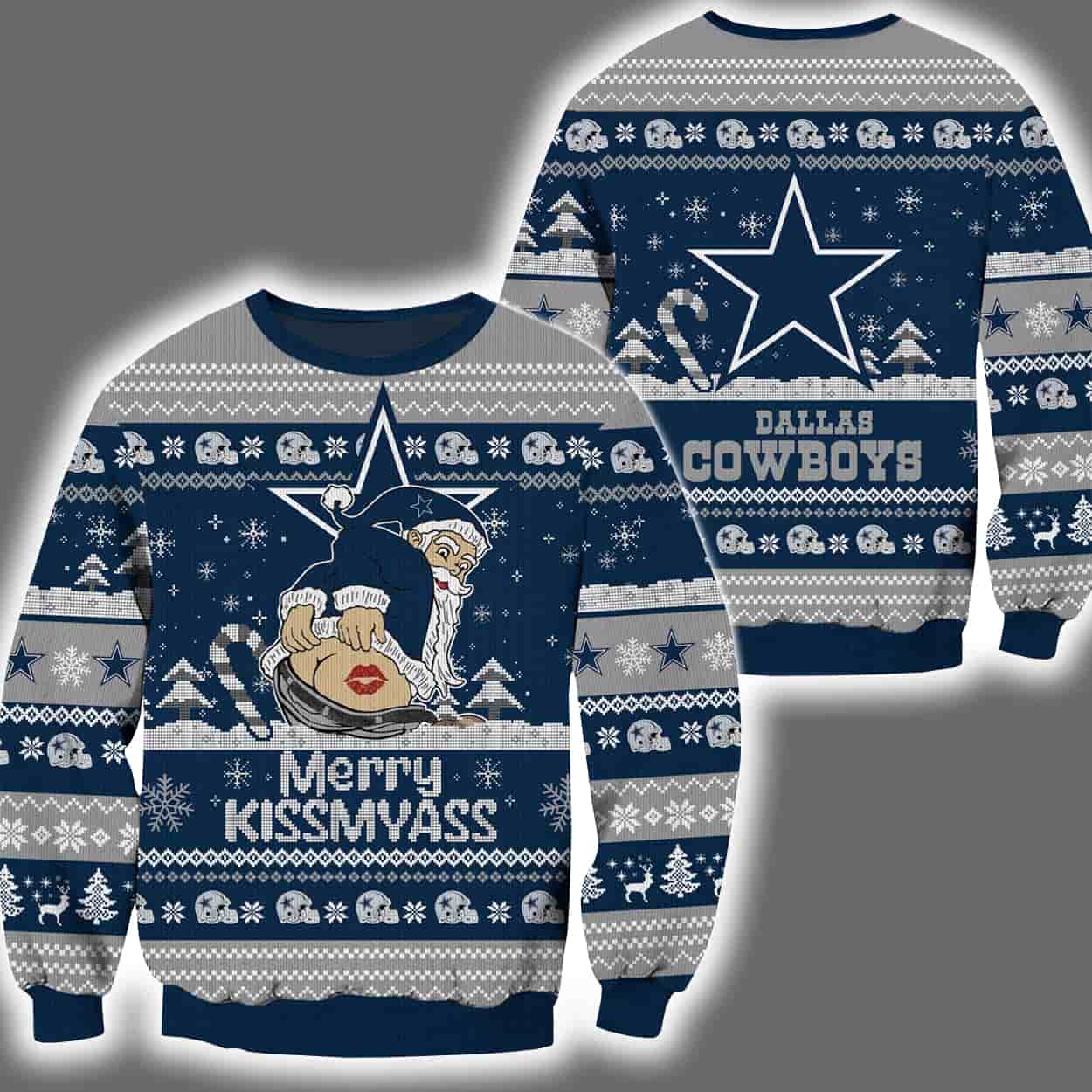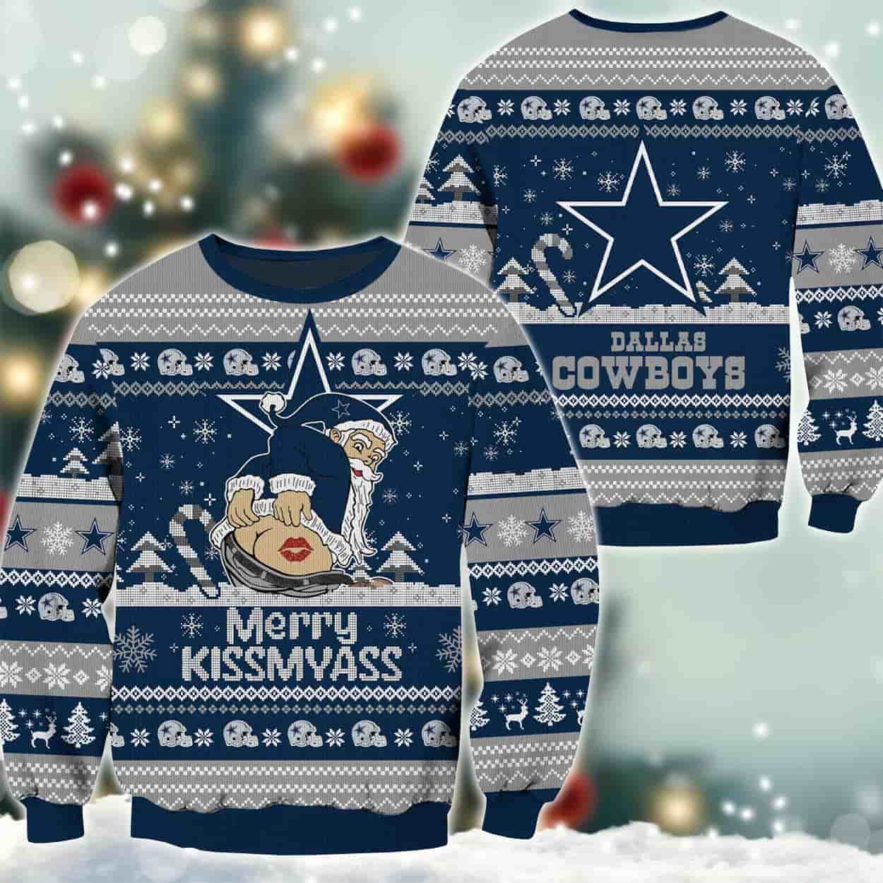 Deck the halls—and your wardrobe—with this sweater, a hilarious and unforgettable tribute to holiday mischief and team spirit. The front features a cartoon Santa Claus in a daring pose: pants pulled down, bare buttocks exposed, and a lipstick kiss stamped right. He’s holding a candy cane with a mischievous grin, while the bold phrase “MERRY KISSMYASS” adds a punch of unapologetic humor. Surrounding the scene are classic holiday patterns—snowflakes, reindeer, and Christmas trees—set against a navy blue backdrop. On the back, the iconic Cowboys star logo shines above the team name in crisp white block letters.
