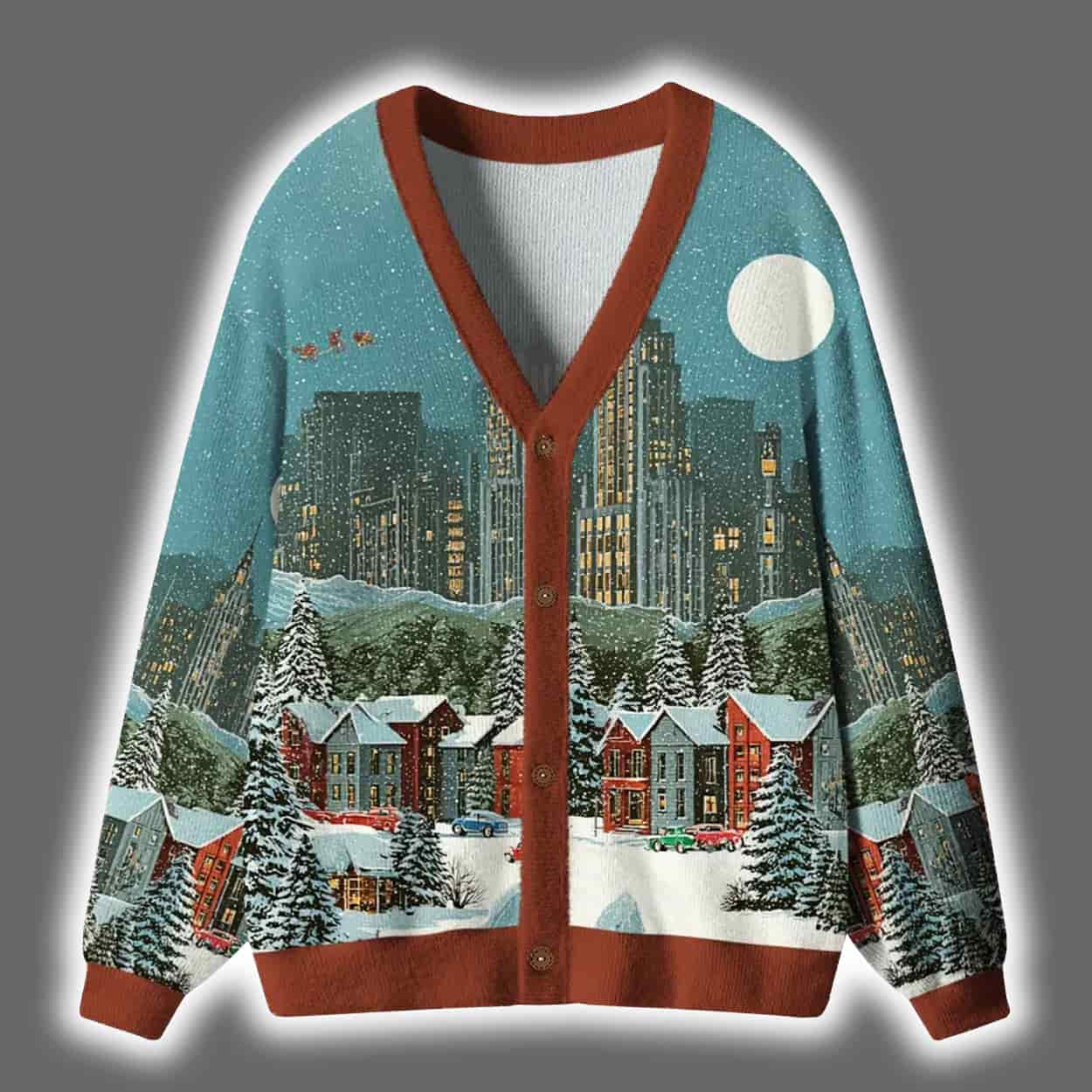 Step into a snow-globe fantasy with this cardigan. This eye-catching piece features a panoramic winter scene that wraps around you like a holiday hug. On the front and back, you’ll find red-roofed houses nestled among evergreen trees, all set against a dreamy city skyline. The sky is a playful swirl of deep blue dotted with whimsical white moons—or are they snowballs?—adding a touch of magic to your every move. Finished with rich brown trim along the neckline, cuffs, and hem, this cardigan is as cozy as it is captivating.