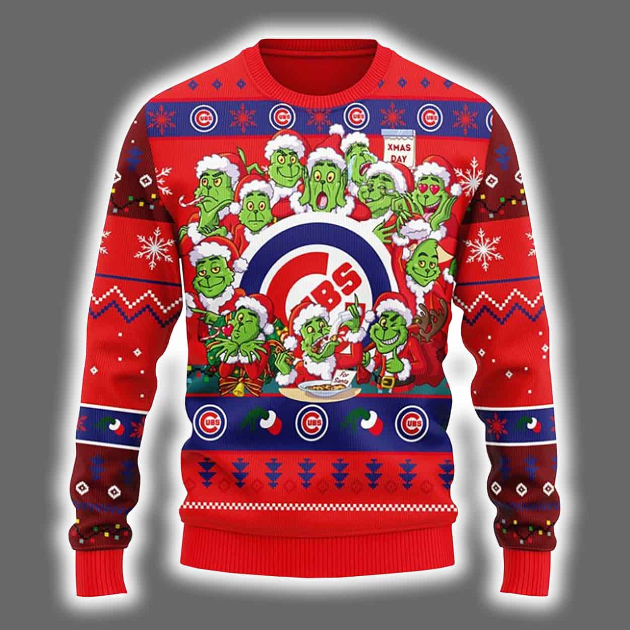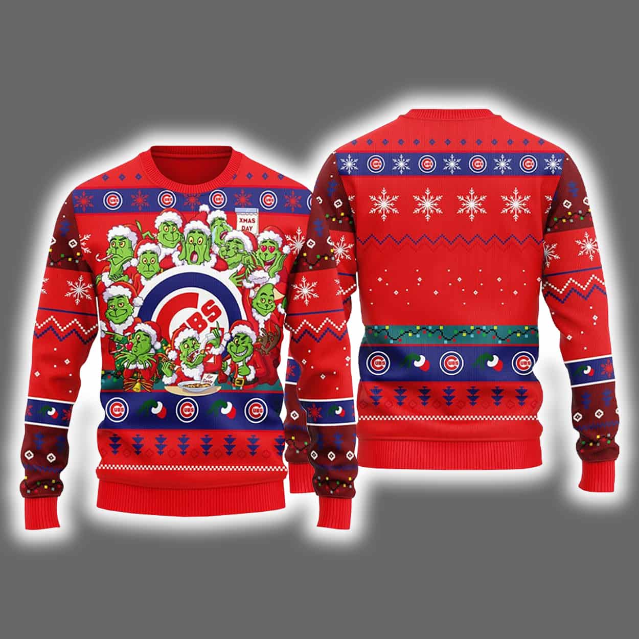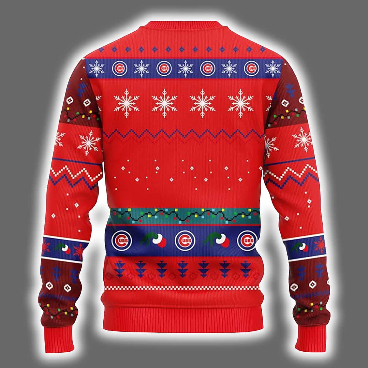Get ready to sleigh the holiday season in style with this sweater! This festive masterpiece features a bold red backdrop adorned with snowflakes, zigzag patterns, and classic holiday motifs. Front and center, the Chicago Cubs logo shines in a circular red, white, and blue design, surrounded by a gang of green Grinch-like characters dressed in Santa suits. The back continues the celebration with rows of Cubs logos and wintry patterns, making this sweater a tribute to team spirit and seasonal sass.