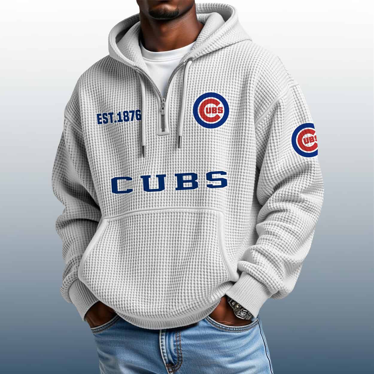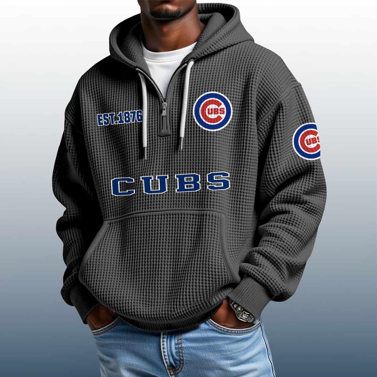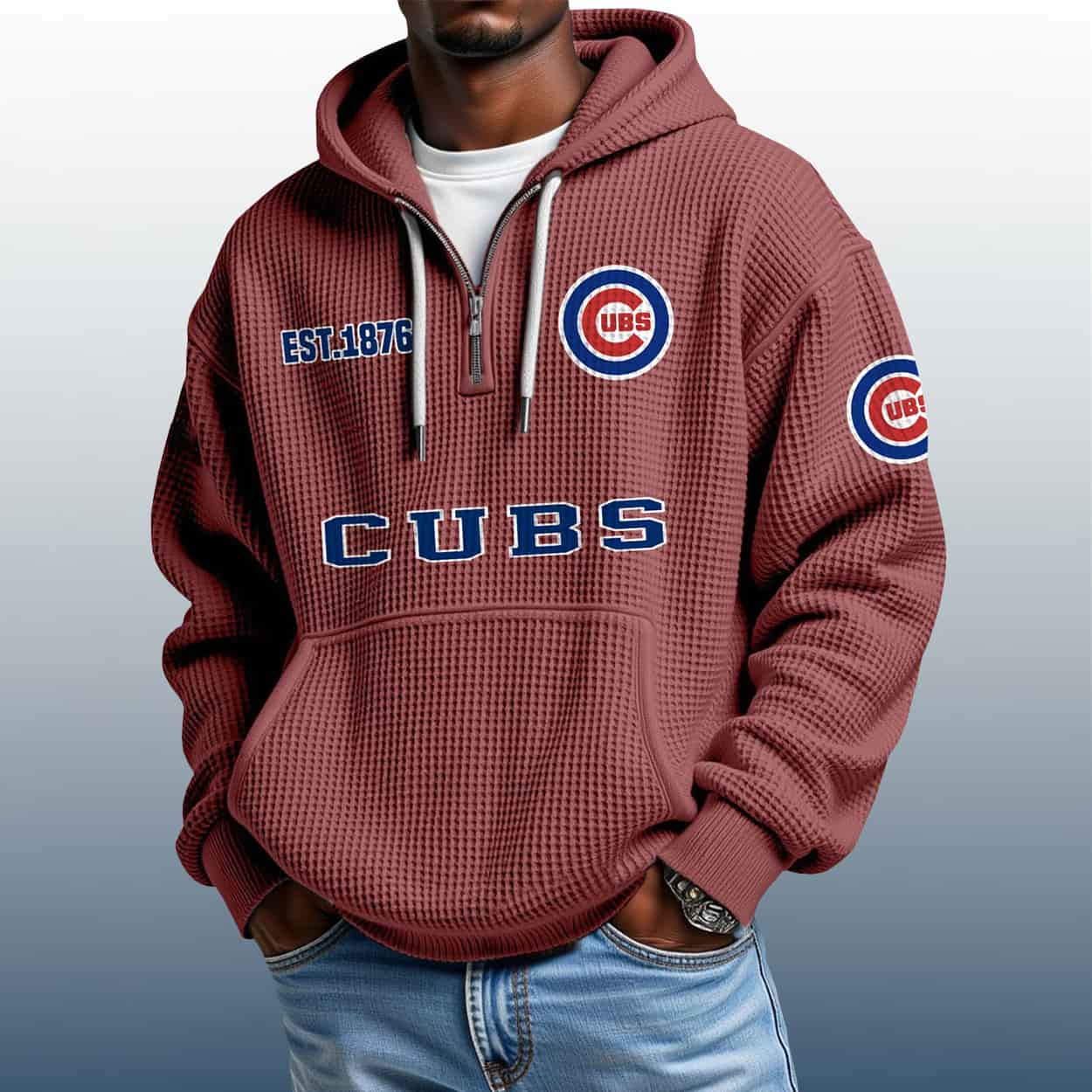 Celebrate your Cubs pride with the Cubs Est 1876 Quarter Zip Waffle Hoodie—a bold blend of vintage flair and modern fan energy.