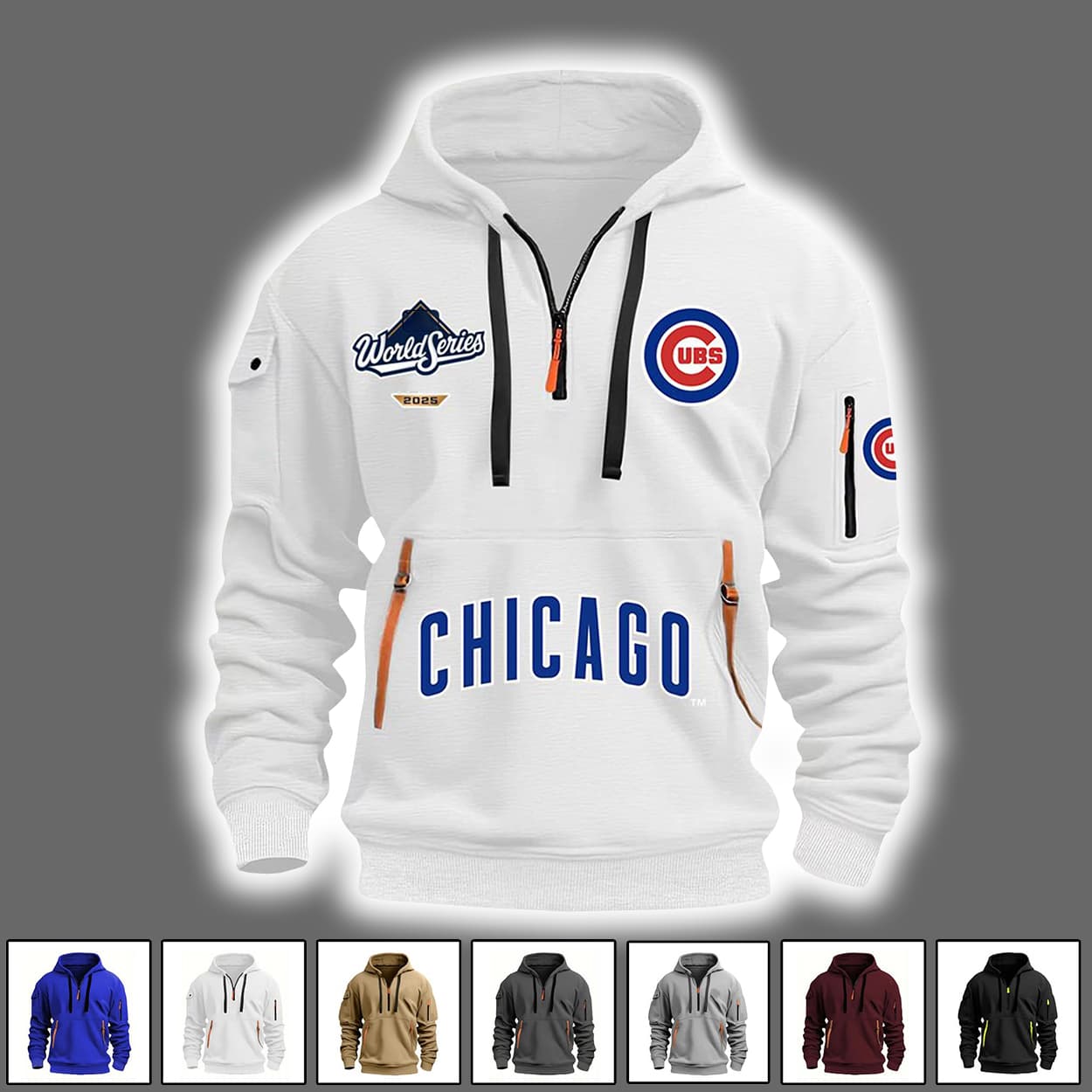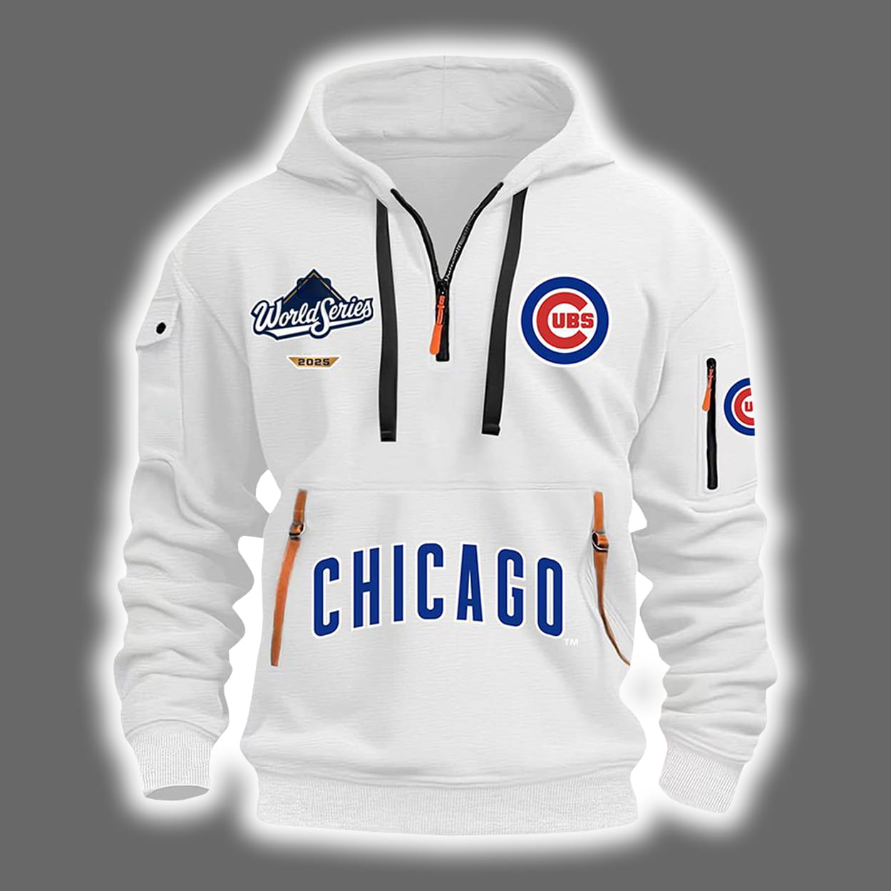 This isn’t just a hoodie—it’s a wearable trophy. This hoodie brings the heat with a half-zip front, bold black zipper detailing, and two vertical orange zippers that scream “game-changer.” The word CHICAGO blazes across the lower front in electric blue, while the classic Cubs circular logo sits proudly above it, reminding everyone who runs the diamond. On the chest, a “World Series” patch adds a rugged twist, and the left sleeve sports another Cubs logo patch plus a zippered pocket for extra flair.