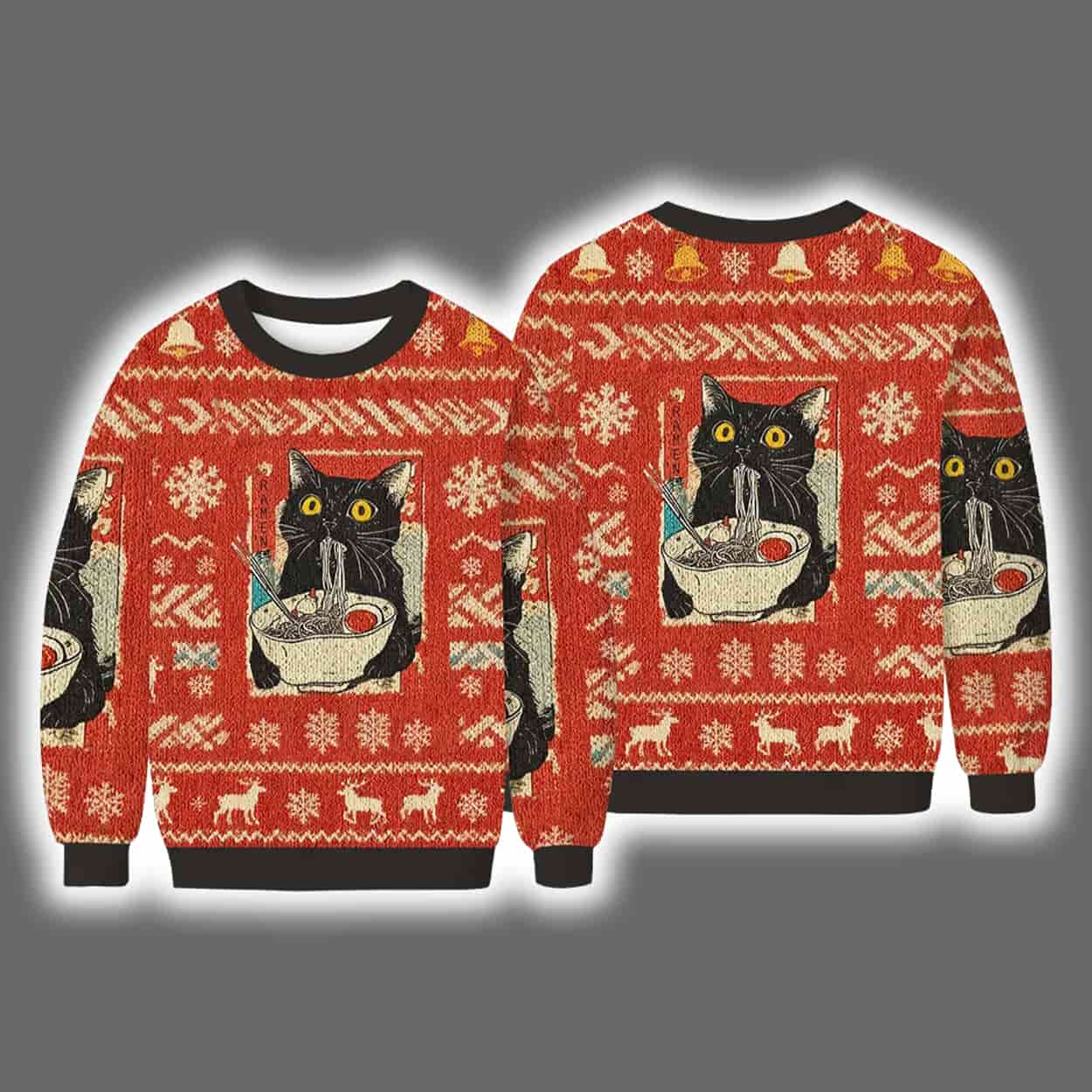 Get ready to sleigh the season with this sweater! This eye-catching design features a wide-eyed black cat perched behind a steaming bowl of ramen, framed in a cozy rectangular vignette. Surrounding the central image are classic holiday motifs—snowflakes, reindeer, and geometric patterns—all in a bold red and white palette. The cat’s curious gaze and the swirling steam from the noodles add a warm, whimsical touch that’s impossible to ignore. With contrasting black cuffs and collar, this sweater is as stylish as it is silly.