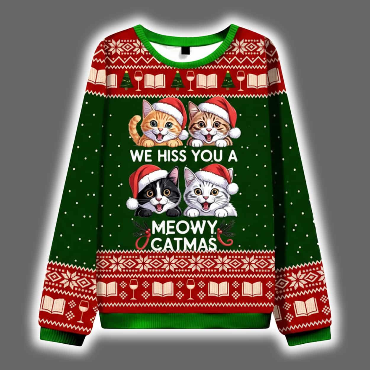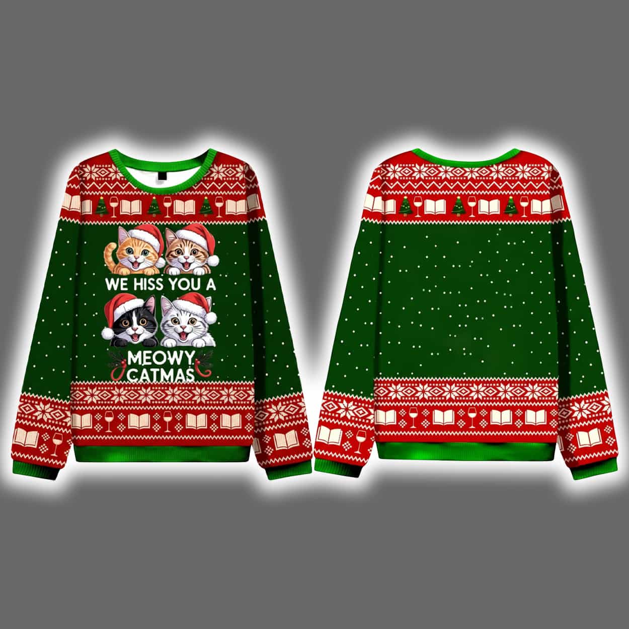 Get ready to pounce into the holiday season with this sweater! This vibrant green sweater is decked out in classic Christmas patterns—snowflakes, reindeer, and cozy houses—wrapped in red, white, and black accents. Front and center, three cartoon cats steal the spotlight, each rocking Santa hats and scarves while serving up some serious cattitude. Beneath their festive scowls, the punny phrase “WE HISS YOU A MEOWY CATMAS” is printed in bold white letters, turning a traditional greeting into a hilarious twist. The back continues the decorative theme, keeping the holiday spirit alive from every angle.