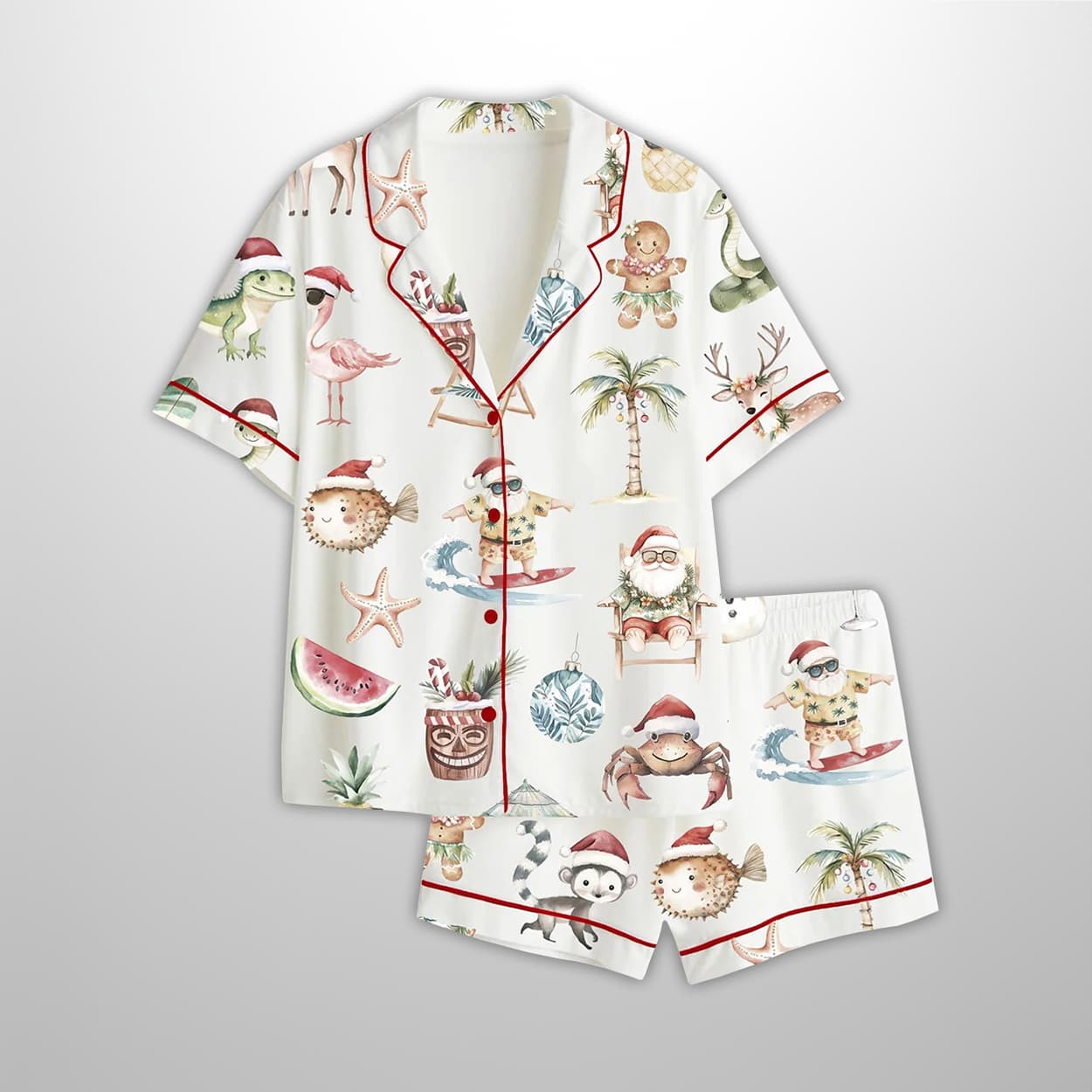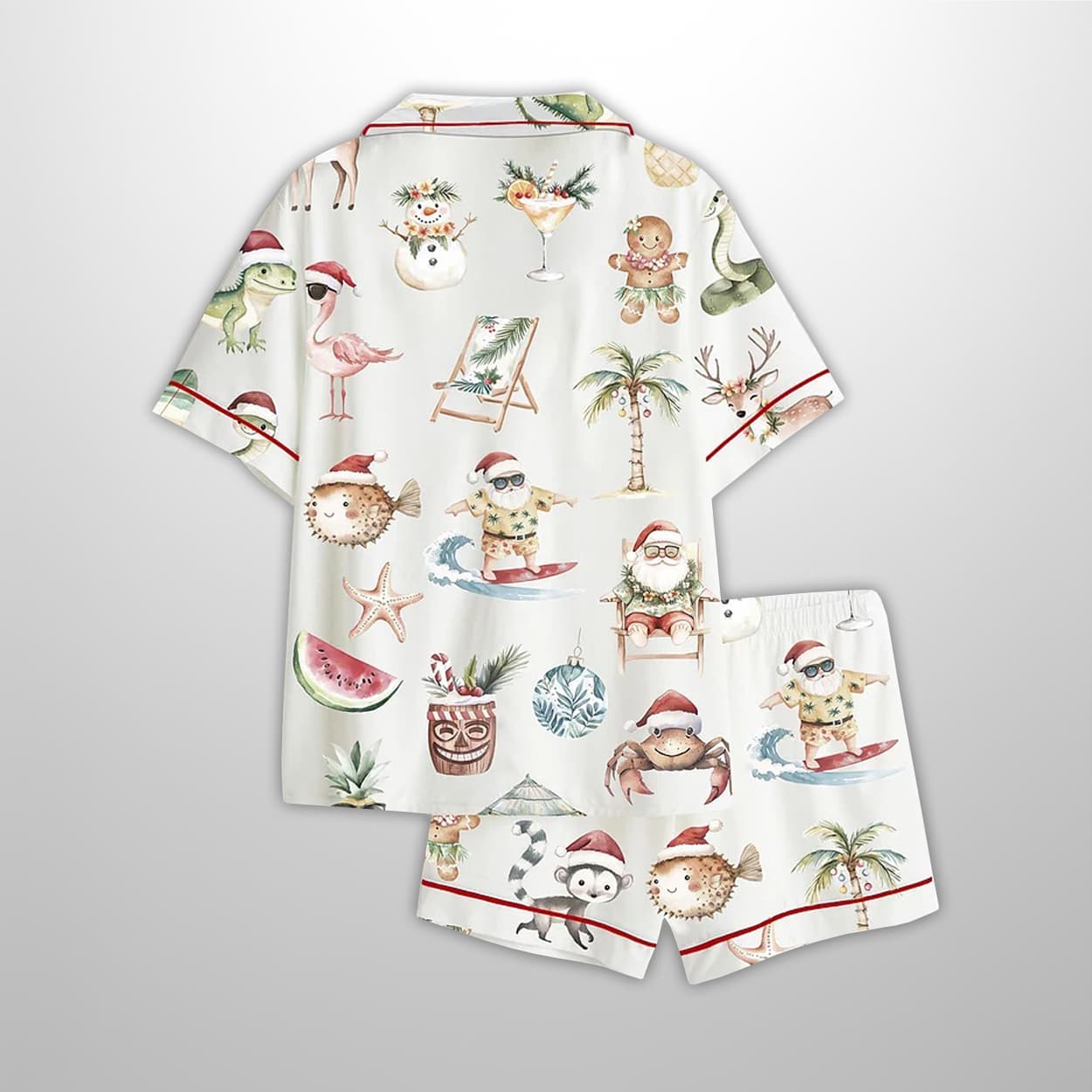 Say aloha to the holidays with this whimsical pajama set that blends Christmas cheer with tropical flair. The short-sleeved button-up shirt and matching shorts are adorned with a watercolor-style print featuring a delightful mix of festive and beachy icons. From turtles and owls in Santa hats to palm trees, coconuts, and watermelon slices, every inch of this set radiates playful charm. Red piping along the edges adds a pop of contrast, framing the joyful chaos of holiday-meets-Hawaii in a way that’s both eye-catching and cozy.