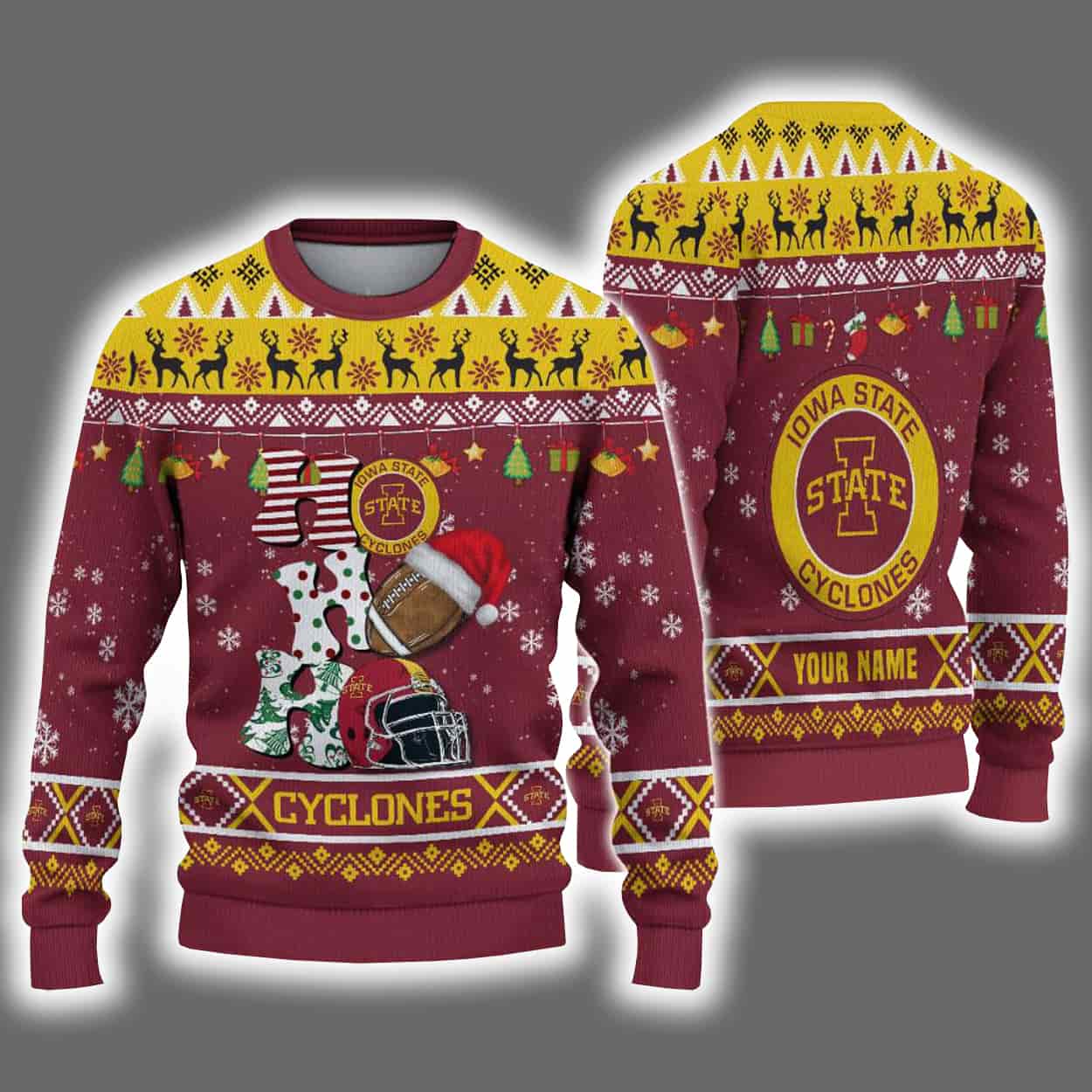 Get ready to jingle all the way to game day with this sweater! This maroon masterpiece is decked out in holiday flair—from snowflakes and reindeer to Christmas trees and candy cane accents. Front and center, the letters “I”, “S”, and “U” are dressed for the season, complete with a Santa hat and a football helmet that screams team pride. The word “CYCLONES” boldly wraps the waistband like a festive rally cry, while the back showcases the iconic Iowa State Cyclones logo surrounded by “IOWA STATE CYCLONES” text. And yes, there’s even a customizable nameplate so you can make it uniquely yours!