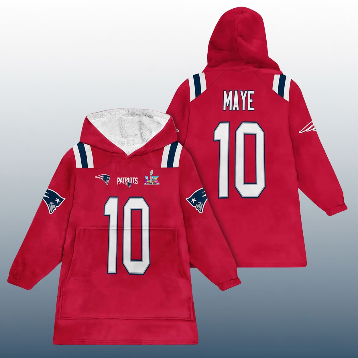 Get ready to huddle up in style with this hoodie. This hoodie brings the energy of the gridiron straight to your everyday look. The front boasts the number “10” in bold white with red trim, flanked by the iconic Patriots logo and a SB LX emblem that adds championship vibes. On the back, “MAYE” sits proudly above the number, making it clear who you’re backing. With team patches on the sleeves and a cozy two-tone hood, this hoodie is a touchdown for fans who love to lounge loud.
