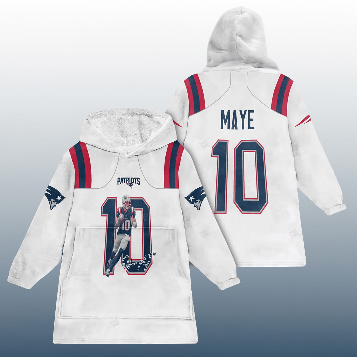 Step into the spotlight with this hoodie—a cozy tribute to rising star quarterback, Maye. The front proudly displays “PATRIOTS” in bold blue above a dynamic number “10” in red and blue, featuring an action-packed image of Maye embedded right into the digits. The sleeves sport the iconic Patriots logo, while red and blue shoulder stripes add a punch of game-day flair. Flip it around and you’ll find “MAYE” printed above the number “10” on the back, echoing the front’s bold styling and team colors. It’s not just a hoodie—it’s a full-on fan experience.
