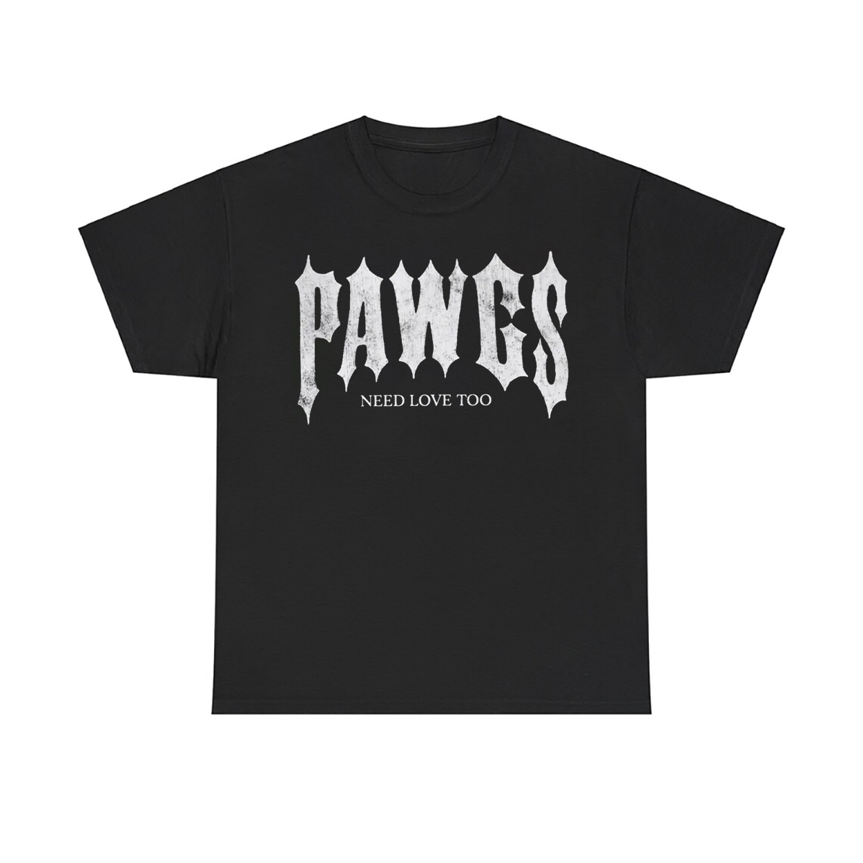 This shirt is not your average graphic tee. With its striking black canvas and dramatic white lettering, this shirt makes a statement before you even say a word. The word “PAWGS” dominates the front in a gothic-style font—sharp, edgy, and impossible to ignore—while the phrase “NEED LOVE TOO” sits just below in a clean, minimalist typeface. The contrast in fonts and message creates a visual punch that’s both playful and provocative, perfect for those who like their fashion with a side of attitude.