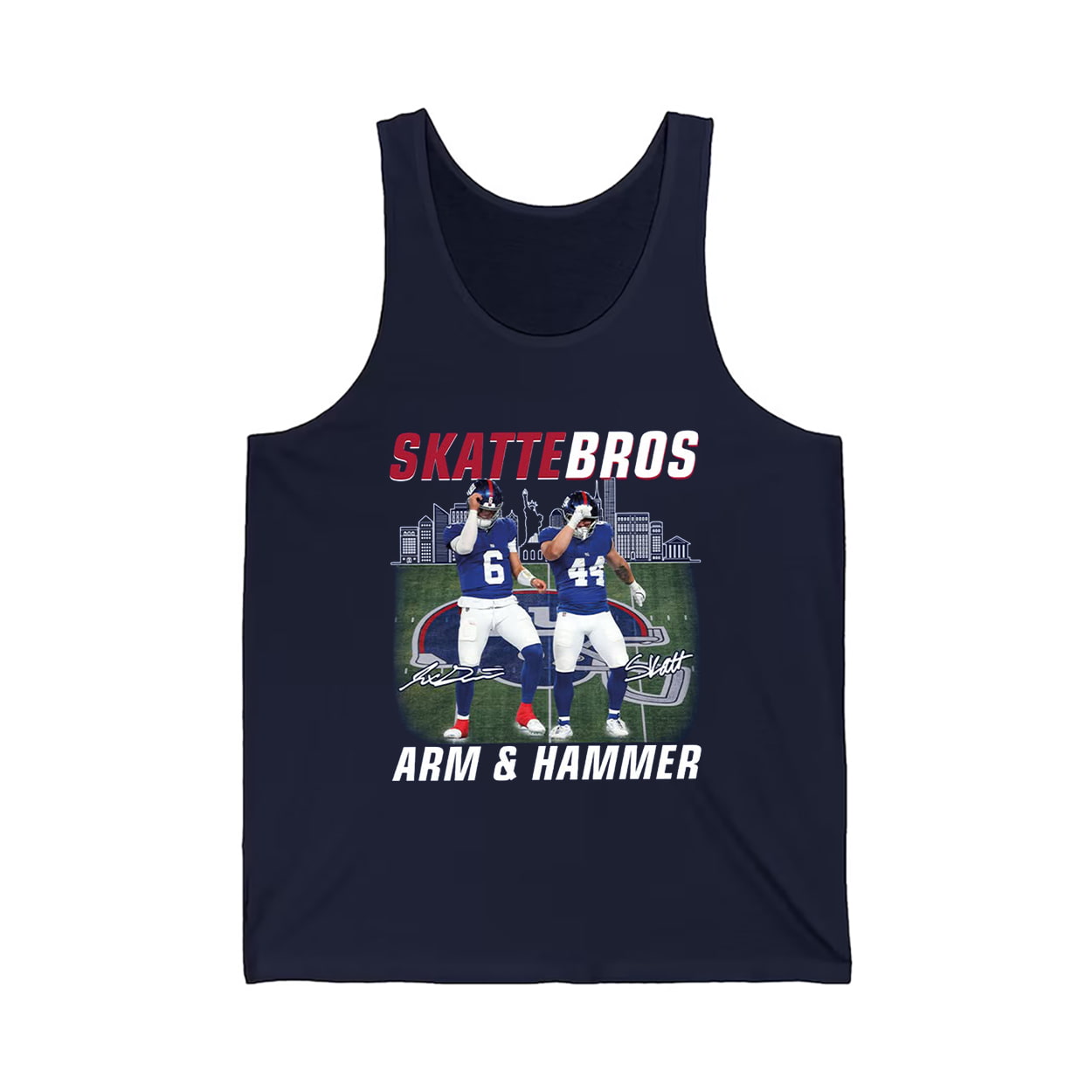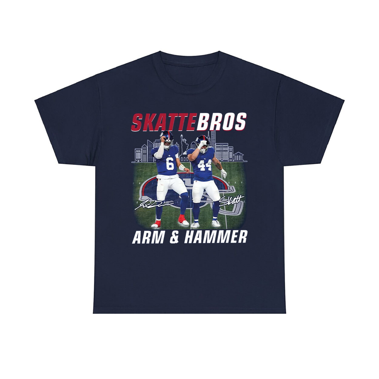 Step onto the field of fashion with this shirt, a navy blue knockout that captures the energy of two football phenoms. The front graphic features players #6 and #44 in full celebration mode, decked out in blue uniforms with red and white accents. Behind them, a city skyline looms like a silent witness to their dominance. The bold “SKATTEBROS” headline crowns the design, while “ARM & HAMMER” below hints at their unstoppable force.