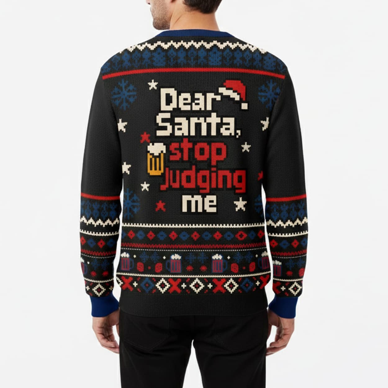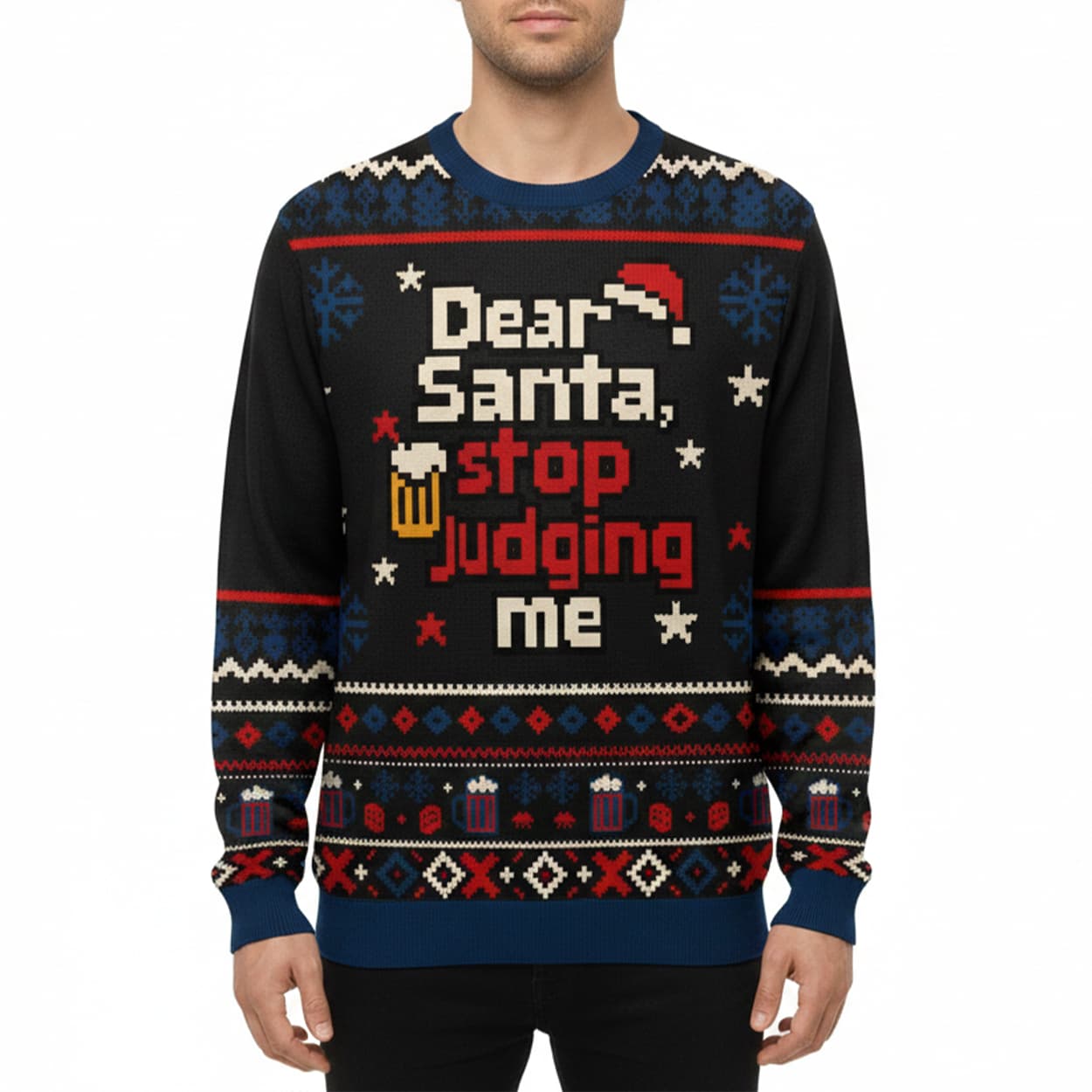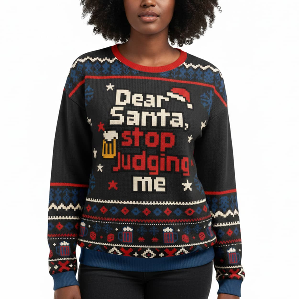 Bring cheeky charm to your holiday wardrobe with the Dear Santa Stop Judging Me Ugly Christmas Sweater—perfect for festive rebels and merry mischief-makers.