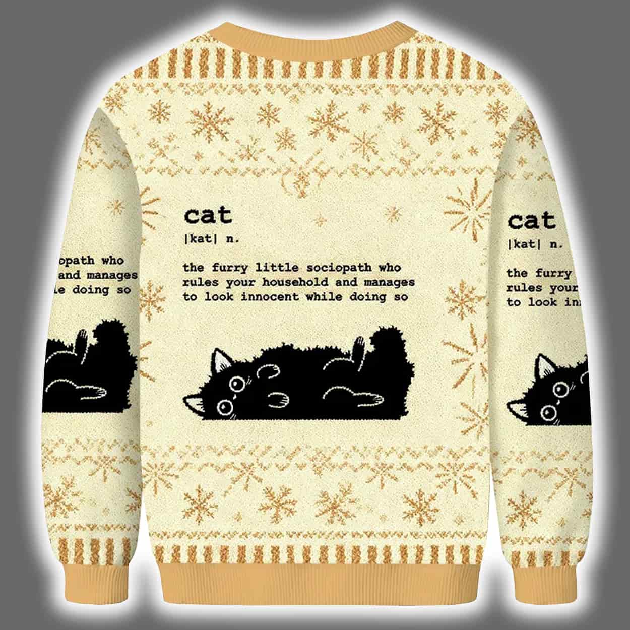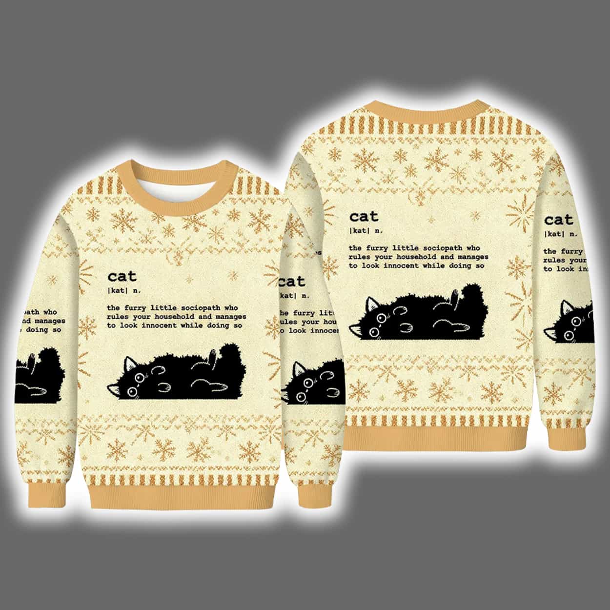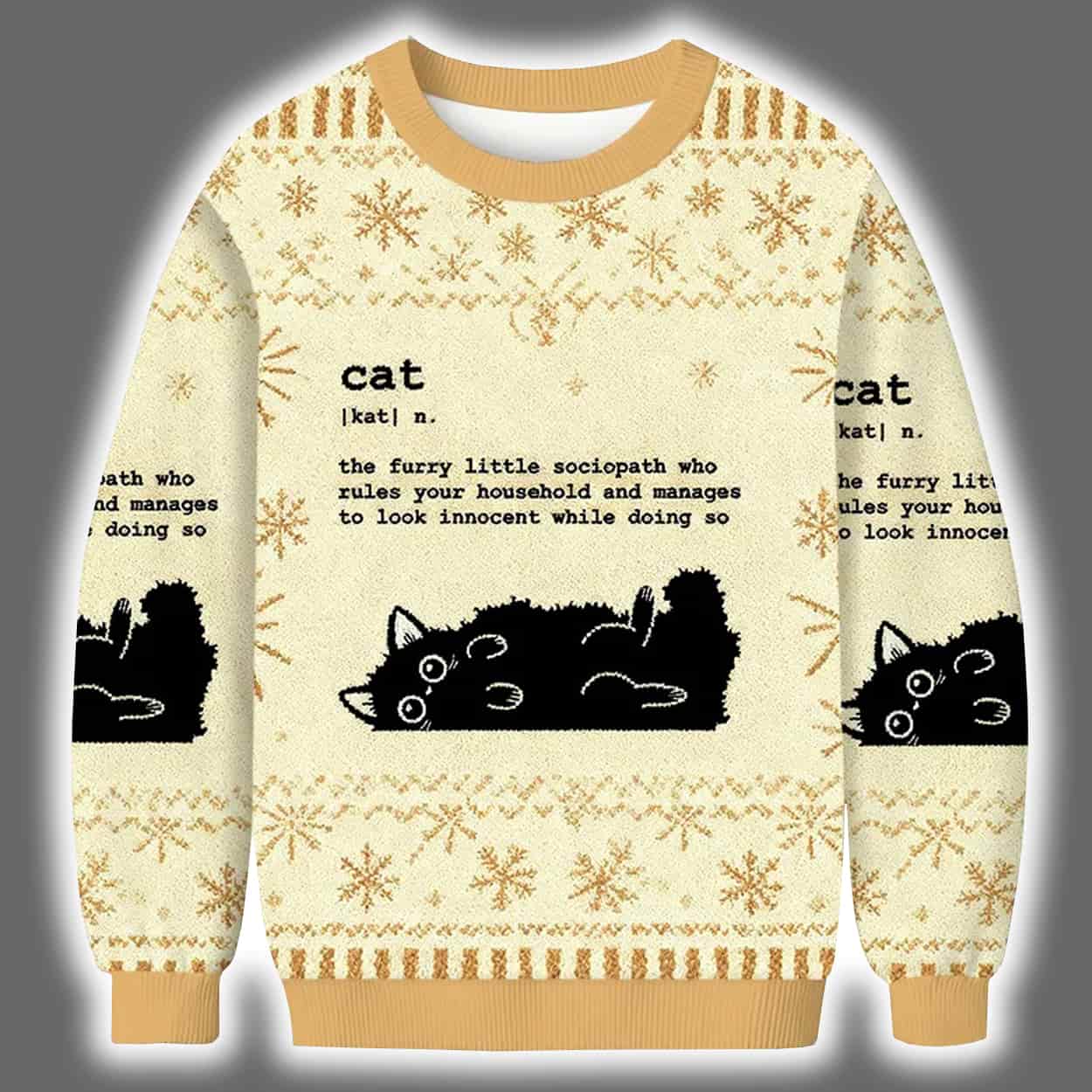 Unleash your inner cat lover with a holiday sweater that’s equal parts cozy and chaotic. This sweater features a cartoon black cat sprawled belly-up across a wintery beige and cream canvas, surrounded by snowflakes and seasonal flair. But the real showstopper? The hilariously accurate definition printed across the front and back: “cat (noun) — the furry little sociopath who takes your household and weaponizes your innocent walks along the sidewalk.” It’s a bold blend of humor and holiday spirit that’s guaranteed to spark laughter at any festive gathering.
