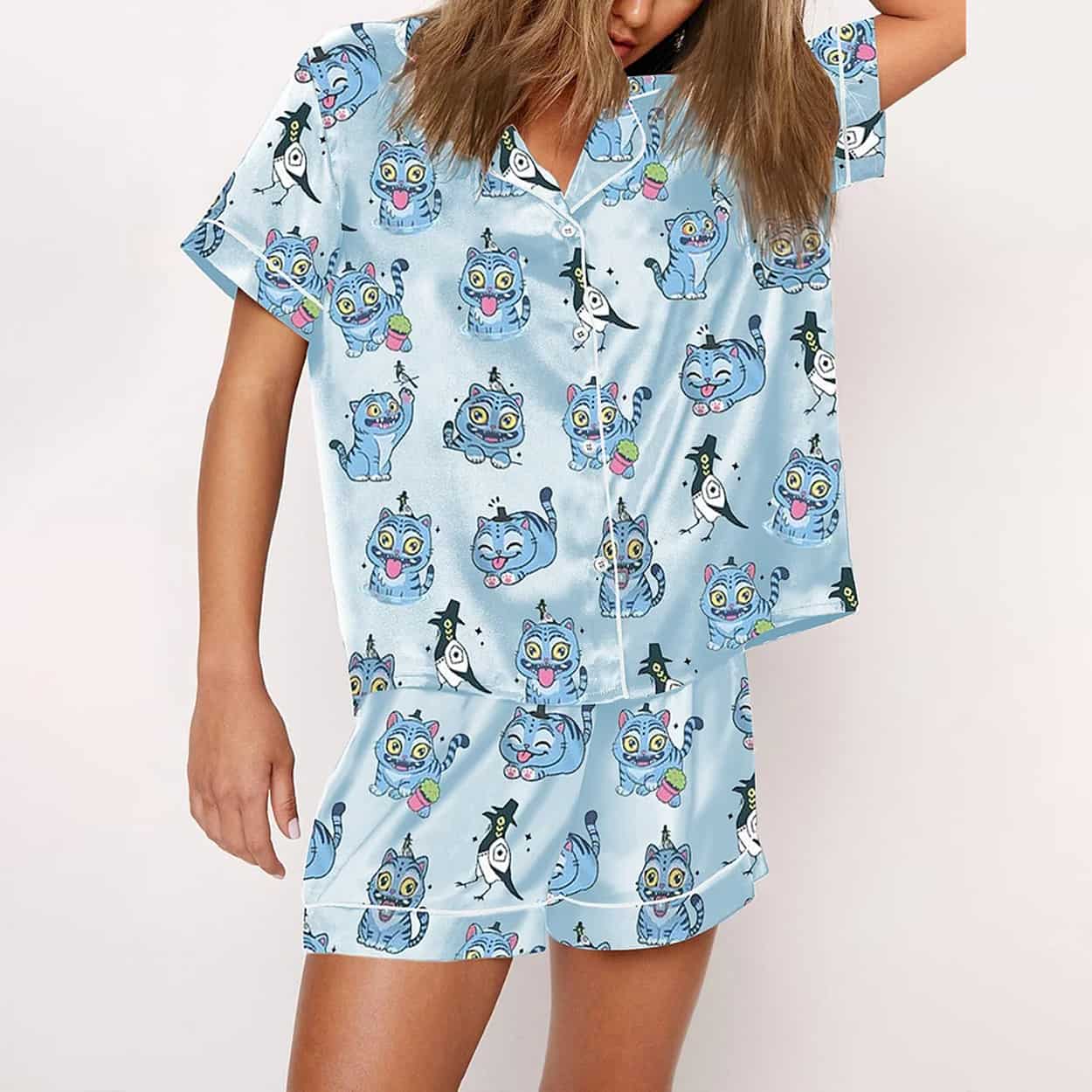 Unleash your inner night-time warrior with the Demon Hunters Tiger Satin Pajama Set—a bold, playful sleepwear ensemble featuring quirky tiger and dog characters ready to guard your dreams.