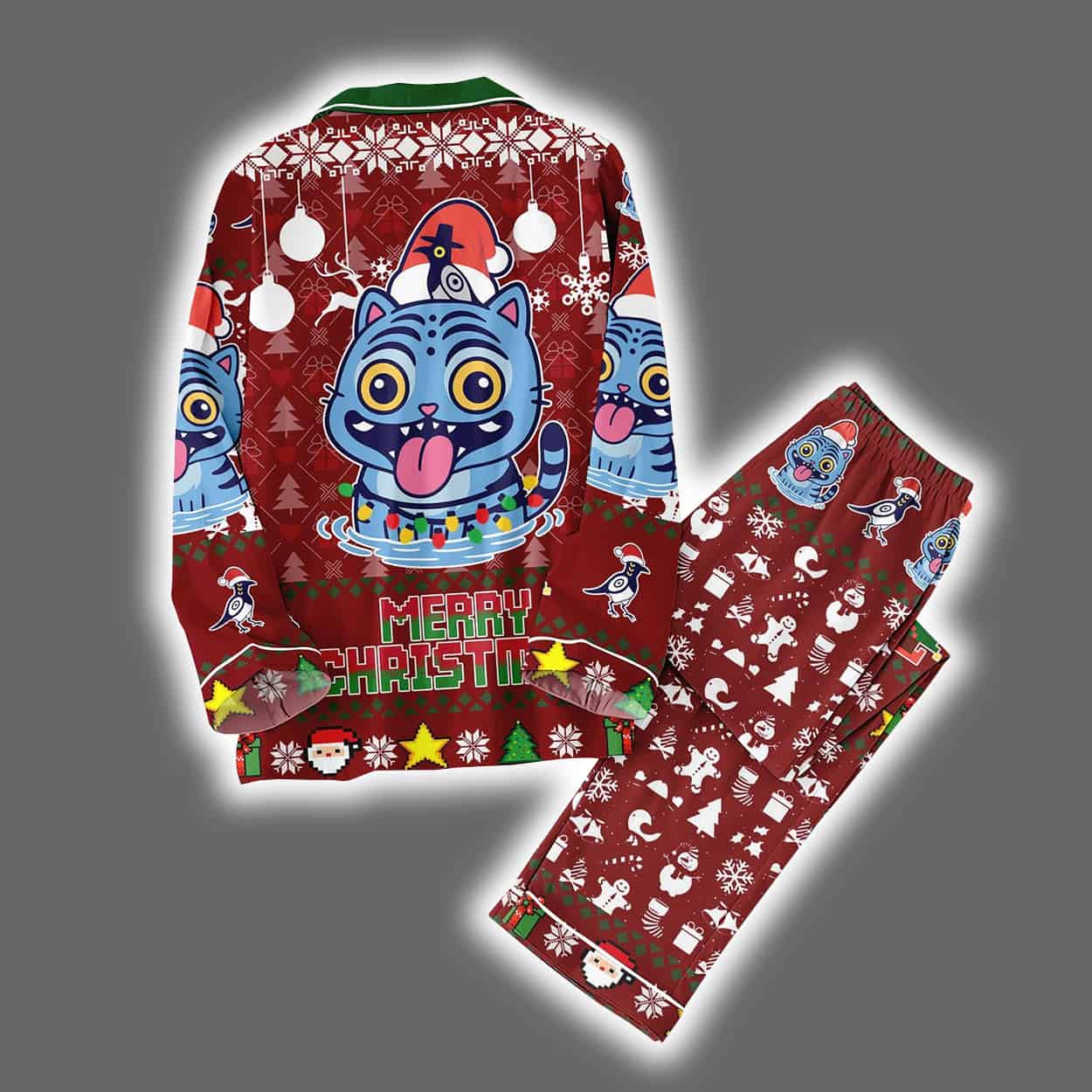Unwrap the joy of the season with this set—a vibrant, head-turning ensemble that’s as cozy as it is charismatic. The long-sleeved button-up shirt features a wide-eyed blue tiger in a Santa hat, tongue out in full derpy glory, surrounded by snowflakes and ornaments. The bold “MERRY CHRISTMAS” text anchors the design with a wink of holiday spirit, while the matching pants burst with candy canes, gingerbread men, and festive icons. With green accents on the collar and cuffs, this set is a visual sleigh ride of holiday fun.