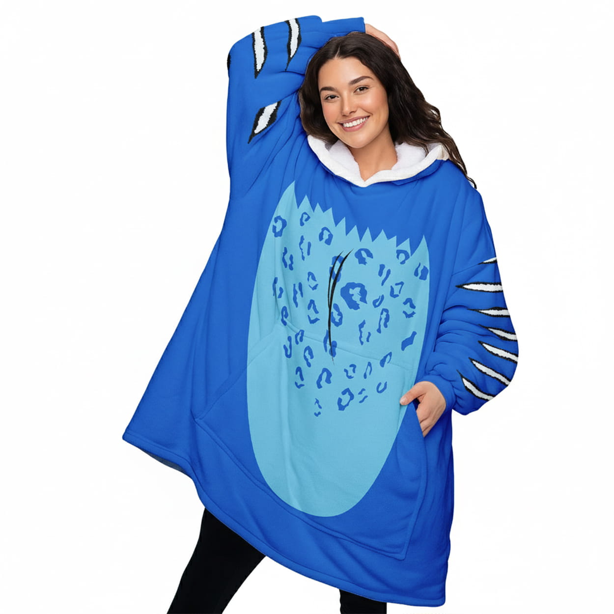 Meet this hoodie—a snuggly, oversized hoodie that transforms everyday lounging into a jungle adventure. The front features a light blue oval patch with jagged edges, playfully resembling a tiger’s open mouth or cracked egg, surrounded by dark blue leopard-like spots. Black drawstrings dangle like whiskers, while the sleeves boast fierce white-and-black claw graphics that add a touch of wild drama. The back keeps it cool with subtle spot patterns, letting the front do all the roaring. It’s not just a hoodie—it’s a wearable mood.