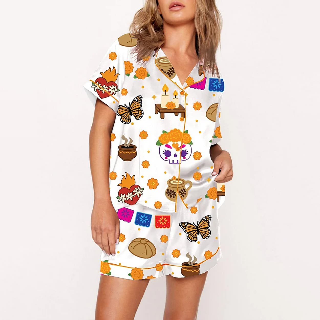 Slip into celebration with this set—a vibrant ensemble that turns bedtime into a cultural fiesta. This short-sleeved button-up and matching shorts are splashed with iconic motifs: radiant sugar skulls, fluttering monarch butterflies, glowing candles, and pan de muerto. Each symbol dances across a crisp white canvas, creating a joyful tapestry of remembrance and reverence. Whether you’re lounging or hosting a cozy night in, this set brings the spirit of the season to life with every wear.