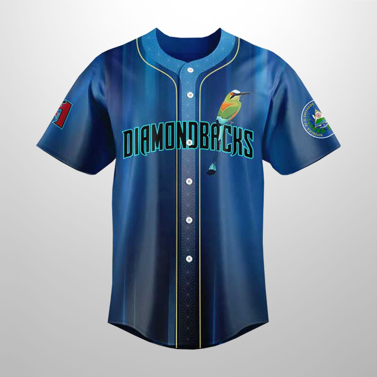 This jersey is a vibrant home run for fans who want to wear their culture on their sleeve. The front showcases the bold “Diamondbacks” wordmark in a sleek teal outline, but the real MVP is the colorful Torogoz—El Salvador’s national bird—perched playfully on the lettering. Bathed in a deep oceanic blue with vertical light streaks, the design is anchored by the Salvadoran coat of arms on the sleeve, creating a look that is as striking as a walk-off hit in the bottom of the ninth.