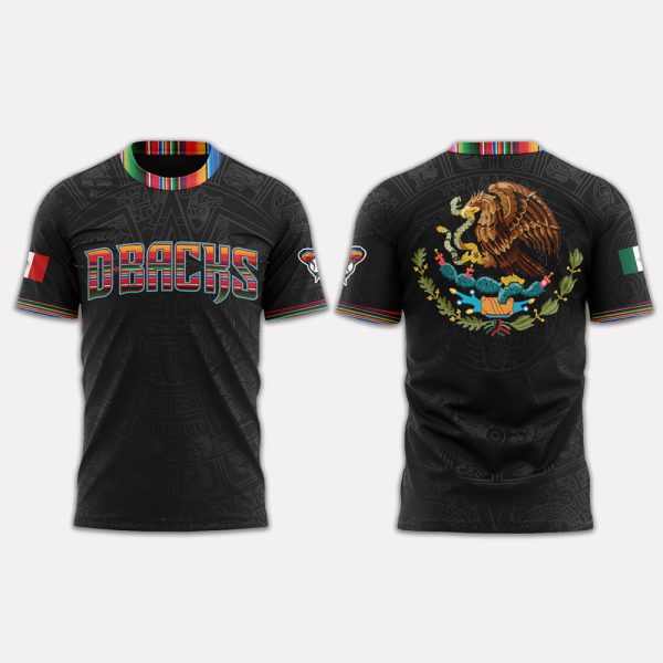 Get ready to hit a cultural grand slam with the Diamondbacks x Mexican Heritage Night 2025 Shirt! This shirt bursts with flair, showcasing “D-BACKS” in a rainbow of colors across the chest, echoing the vibrant spirit of Mexico. The sleeves and collar feature subtle Mexican flag stripes, while a mini flag patch adds a patriotic punch. Flip it around, and the back steals the show with a majestic eagle perched atop a cactus—straight from the Mexican coat of arms—surrounded by intricate patterns that nod to ancient artistry. This shirt offers a comfy fit for all sizes, making it ideal for cheering at Chase Field or dancing at a fiesta. It’s a perfect blend of sports swagger and cultural pride, ready to turn heads at any event!