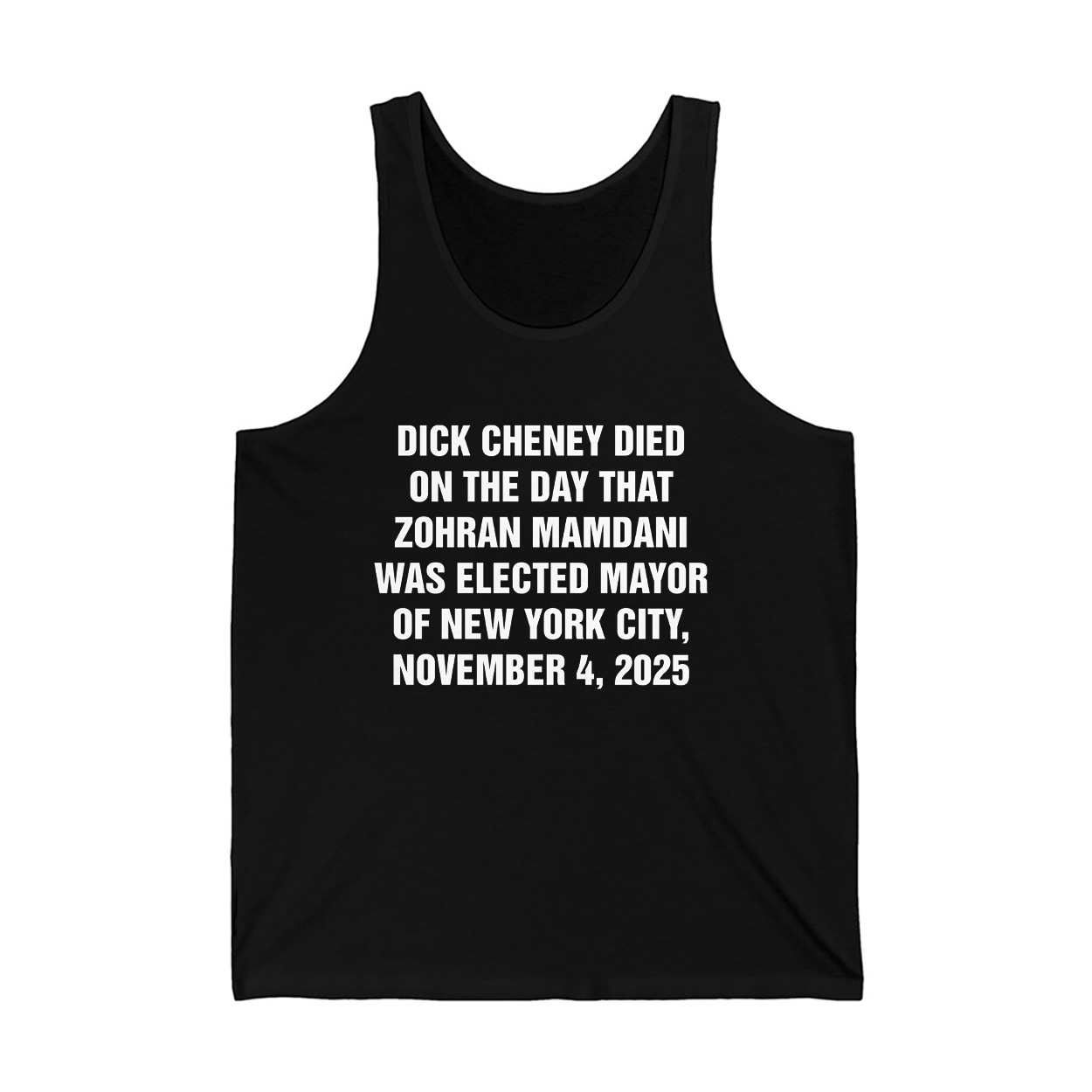 Make a statement with this Dick Cheney Died On The Day That Zohran Mamdani Was Elected Mayor Of New York City Shirt: a fictional political twist that blends satire, speculation, and streetwear edge. Perfect for those who love provocative fashion and future-forward storytelling.