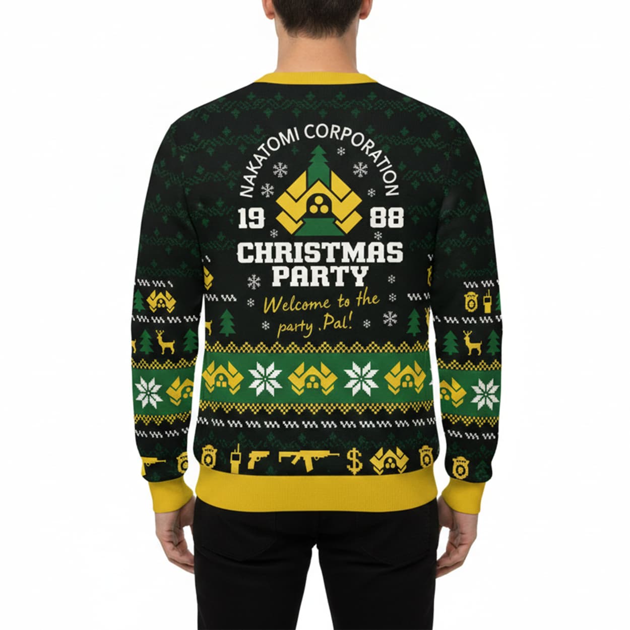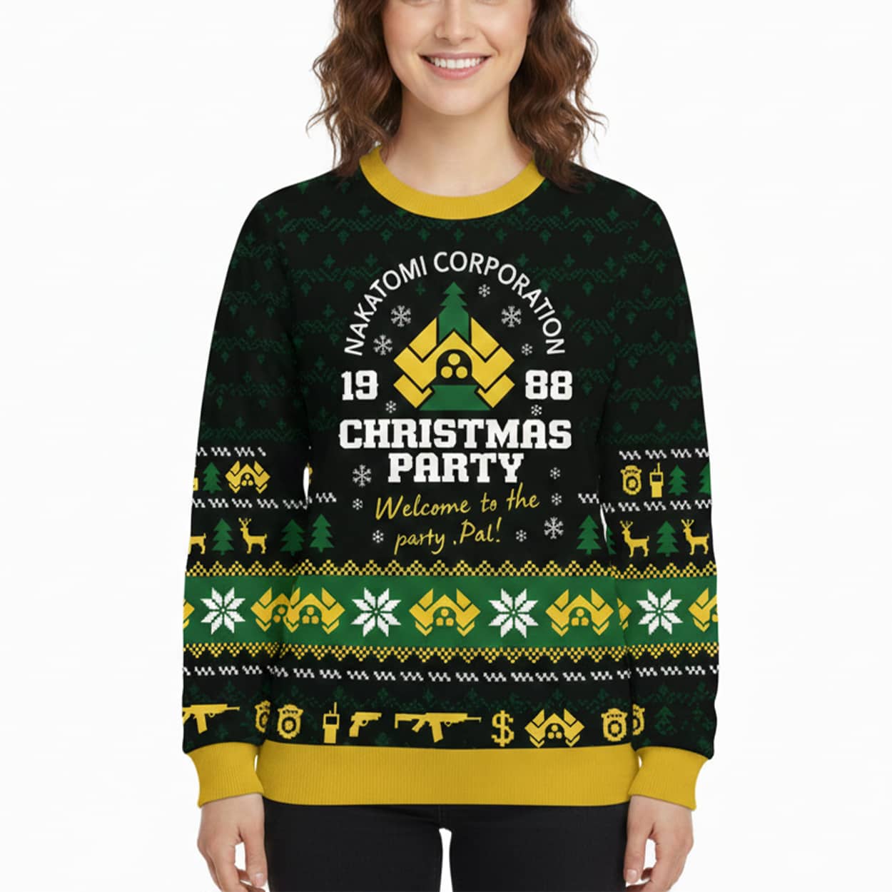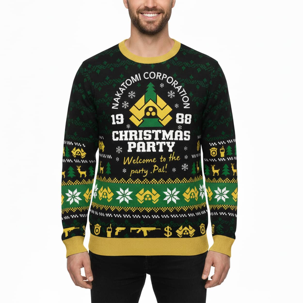 This sweater is a holiday tribute to the ultimate unconventional Christmas classic. Set against a bold black backdrop, it features festive patterns in green, yellow, and white—snowflakes, reindeer, Christmas trees, and even helicopters and dollar signs. Front and center is the iconic yellow Nakatomi Corporation building, flanked by “1988,” the year of cinematic mayhem. Above it, the text reads “NAKATOMI CORPORATION,” while below, “CHRISTMAS PARTY” sets the scene. And just to seal the deal, the legendary quote “Welcome to the party, Pal!” adds a punch of Bruce Willis energy to your holiday wardrobe.