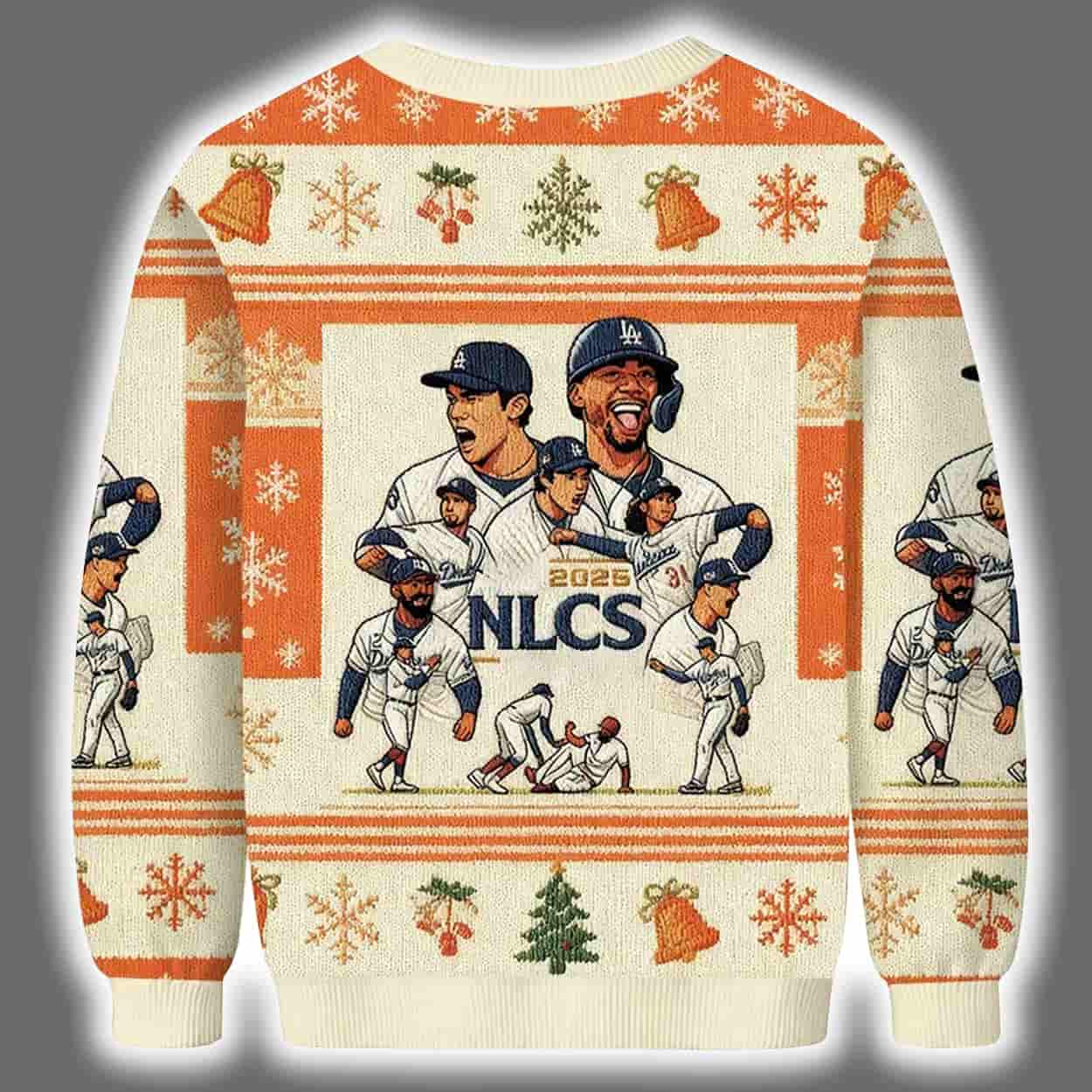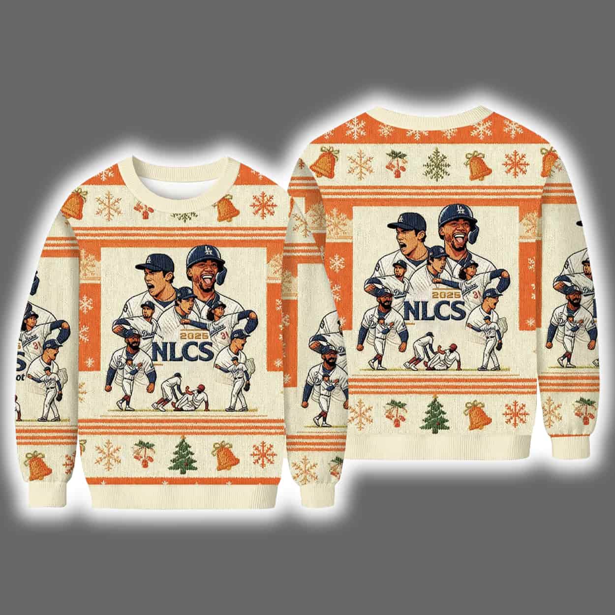 Get ready to sleigh the holiday season with this sweater! This eye-catching design features a vibrant mix of orange, green, and white holiday motifs—snowflakes, Christmas trees, and bells—wrapped around dynamic illustrations of baseball players in action. Front and center, the bold “NLCS” text proudly celebrates the Dodgers’ triumphant run in the National League Championship Series. With the same spirited design mirrored on the back, this sweater is a full-circle tribute to victory and festive flair.