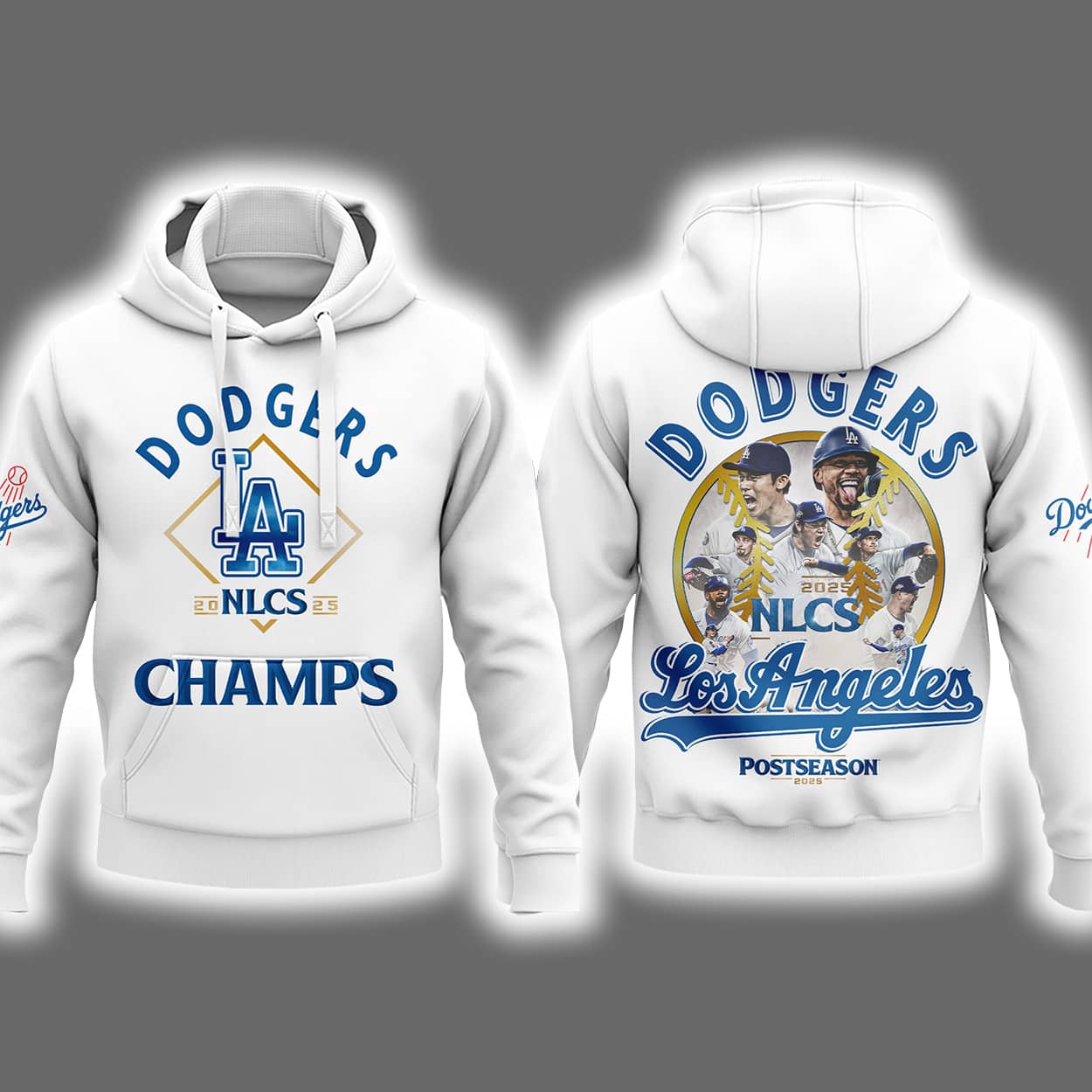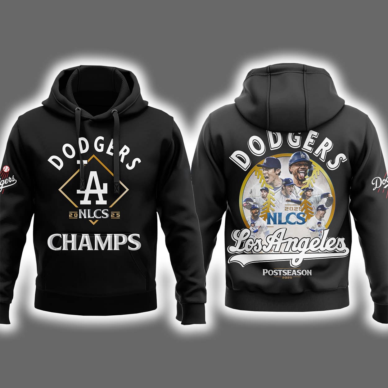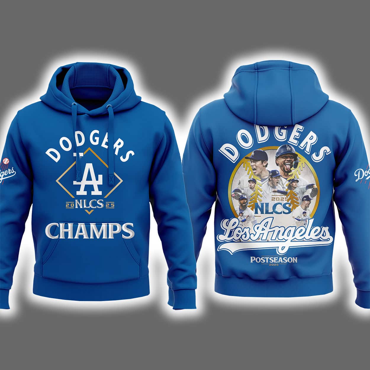This hoodie isn’t just warm—it’s fire. The front proudly displays “DODGERS,” “NLCS,” and “CHAMPS” in bold lettering, anchored by a diamond-shaped LA logo that hits like a home run. It’s clean, confident, and unmistakably Dodgers. But the real celebration lives on the back: a dynamic collage of Dodgers players in action, frozen mid-swing and mid-cheer, capturing the raw energy of their 2025 NLCS triumph. Surrounding them are the words “DODGERS,” “NLCS,” “Los Angeles,” and “POSTSEASON,” turning this hoodie into a wearable highlight reel.