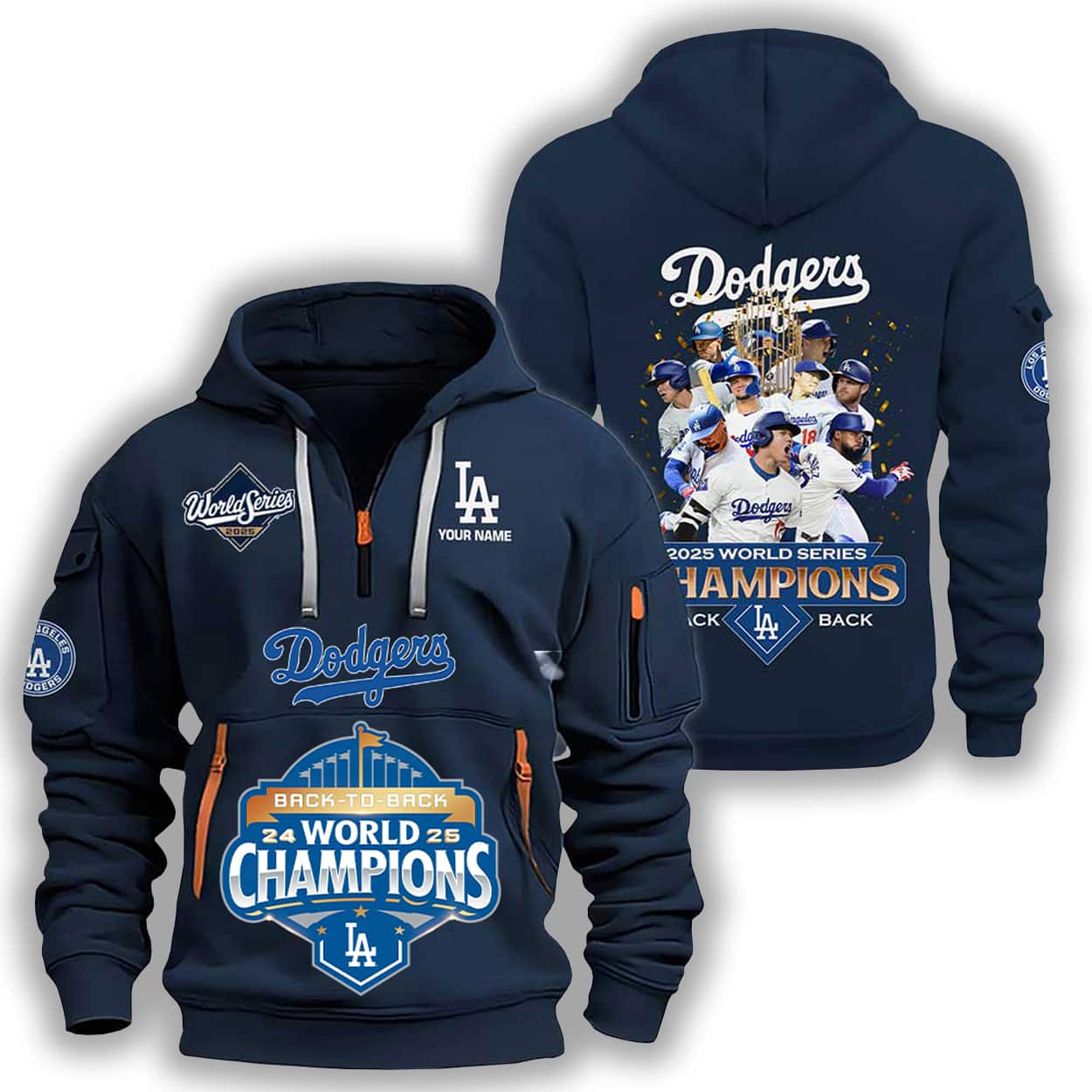 Step into championship mode with this hoodie—a fan favorite that’s as fierce as the team it honors. This navy blue hoodie packs a piece with a stadium-inspired “2025 WORLD SERIES CHAMPIONS” graphic front and center, flanked by the iconic Dodgers script and “LA” logo. Customizable with “YOUR NAME,” it’s made to feel personal. The sleeves sport bold patches, including “World Series” and the Dodgers emblem, while the orange zipper accents add a pop of energy. On the back? A celebration in full swing—Dodgers players mid-victory, surrounded by the triumphant text “Dodgers 2020 WORLD SERIES CHAMPIONS” and the rallying cry “BACK TO BACK.”