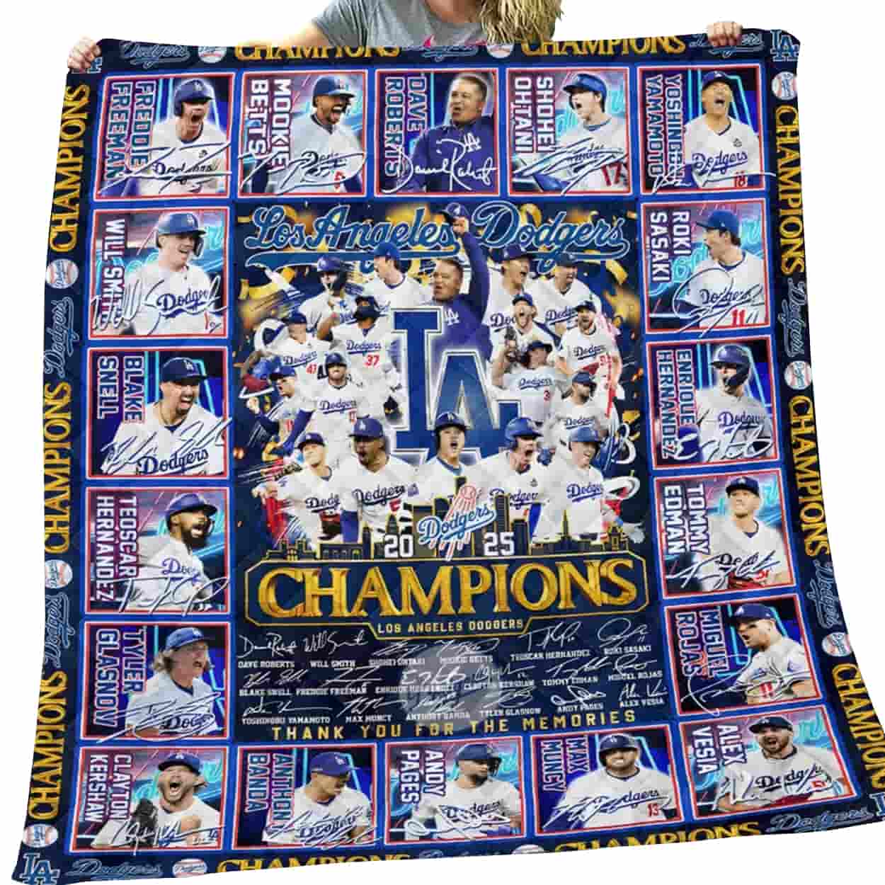 Get ready to relive the magic of the Dodgers’ 2025 World Series triumph—every time you cozy up! This blanket bursts with energy, showcasing a dynamic collage of your favorite players mid-celebration, their signatures etched beside their portraits like a roll call of legends. At the heart of the design, a bold “LA” logo anchors the excitement, surrounded by the electrifying word “CHAMPIONS” and the golden year “2025” in proud display. Above it all, “Los Angeles Dodgers” reigns, while the heartfelt phrase “THANK YOU FOR THE MEMORIES” reminds fans of the unforgettable journey.