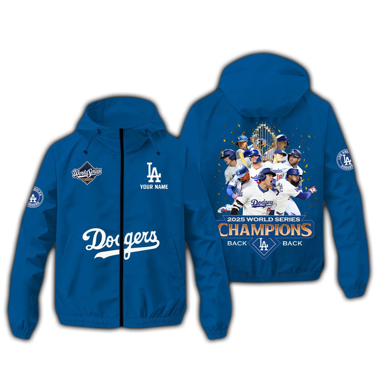 This isn’t just a jacket—it’s a wearable victory parade. This jacket brings the thrill of back-to-back wins to your everyday style. On the front, the classic Dodgers script sits proudly beneath the iconic “LA” logo, with a customizable “YOUR NAME” feature that makes it uniquely yours. On the sleeve, including “World Series Champions,” add extra flair. But the real showstopper is the back: a vivid graphic of Dodgers players mid-celebration, crowned by the team logo and a stylized championship trophy. Below, bold text reads “2025 WORLD SERIES CHAMPIONS BACK 2 BACK,” reminding everyone that greatness runs deep.