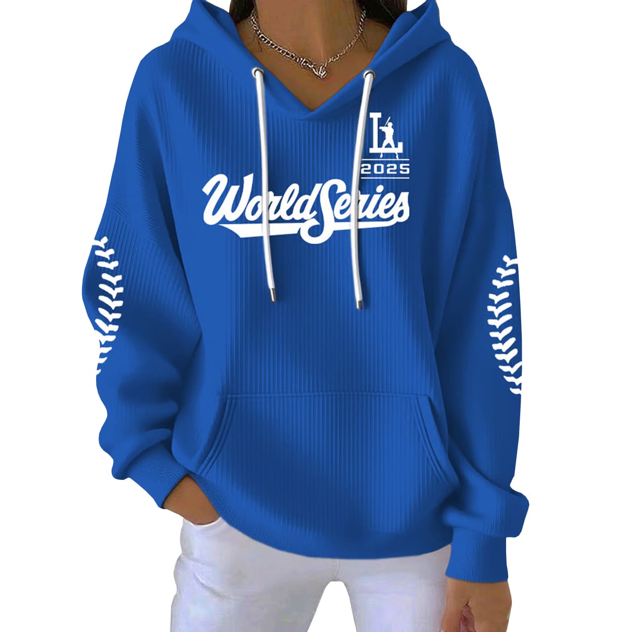 Step into championship vibes with this hoodie. This electric blue hoodie features crisp white drawstrings and a standout chest graphic that reads “World Series” in a stylized font, crowned by the “LA” logo and the year “2025”—a nod to the team’s legendary win. The sleeves steal the show with white baseball-style print graphics that wrap around like a fastball in motion, adding a dynamic edge to the overall look. It’s the perfect blend of sporty swagger and fan pride, designed to turn heads from the bleachers to the streets.