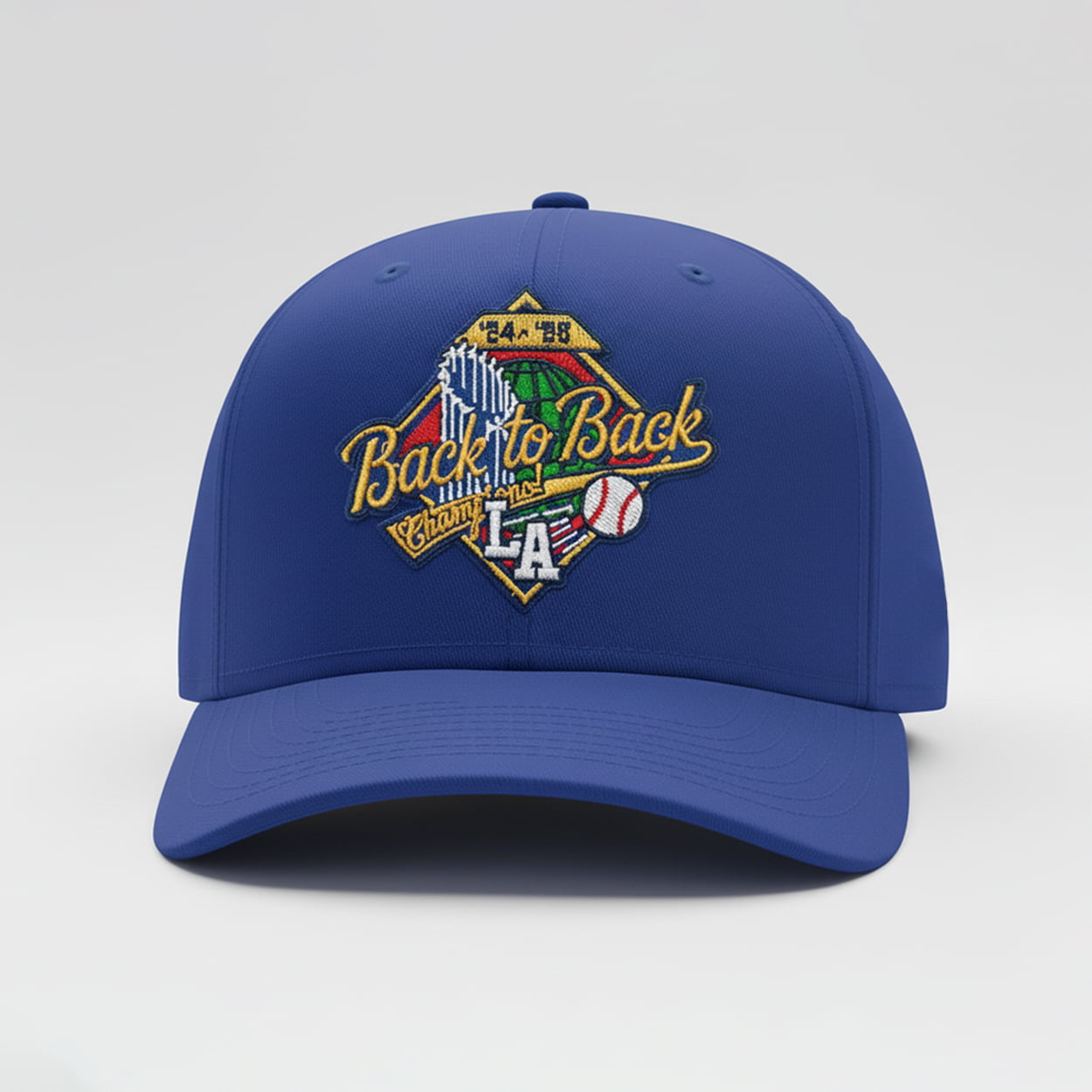 Step into greatness with this hat—a bold, royal blue masterpiece that screams victory. The front panel features two gleaming trophy icons labeled “’24” and “’25,” a nod to the team’s consecutive triumphs. Framed by palm trees and a baseball diamond motif, the embroidery captures the spirit of Los Angeles in full swing. Below the trophies, the phrase “Back to Back Champions” pops in yellow and white script, anchored by a classic baseball and LA logo. It’s not just a hat—it’s a wearable celebration.