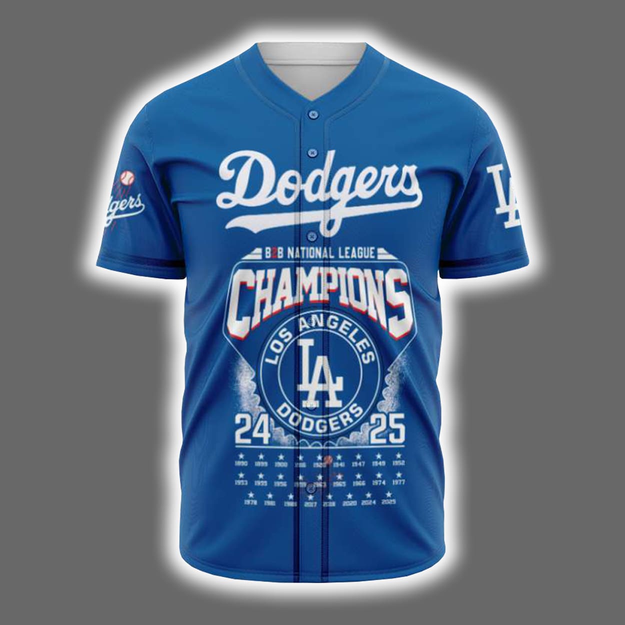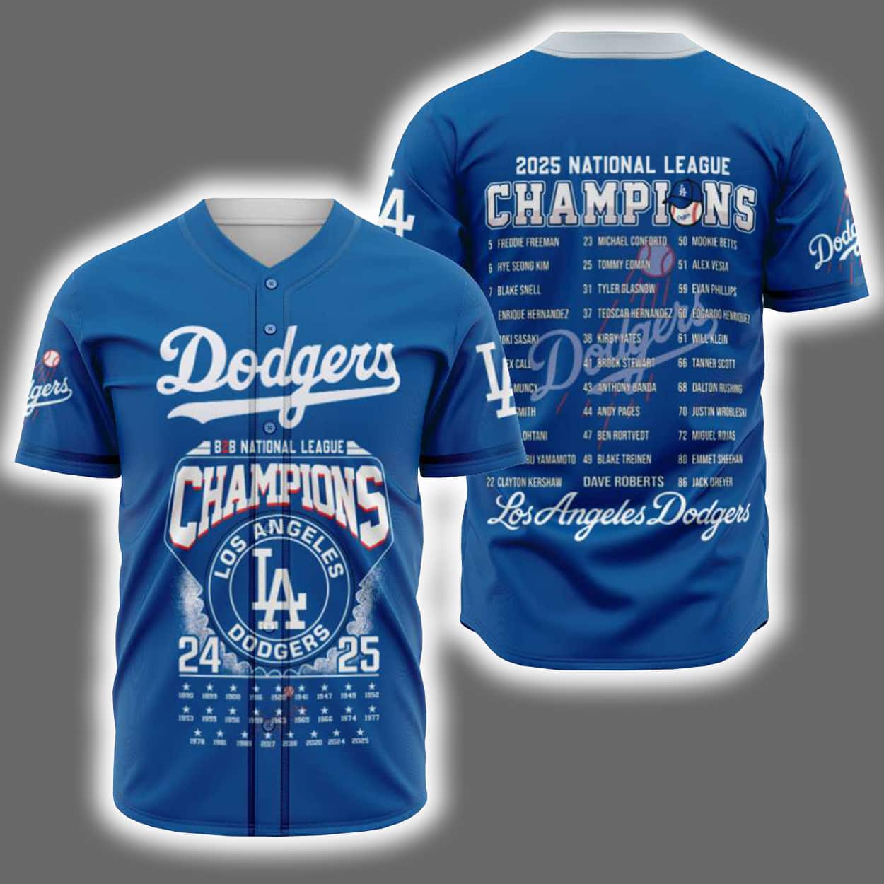 This isn’t just a jersey—it’s a full-on celebration printed into every inch. The front proudly displays “Dodgers” in classic white script, with “2025 NATIONAL LEAGUE CHAMPIONS” stamped below in bold. A circular emblem featuring “LOS ANGELES DODGERS” and the iconic LA logo anchors the design, flanked by the numbers “24” and “25” to mark the back-to-back triumph. Flip it over and the party continues: “2025 NATIONAL LEAGUE CHAMPIONS” headlines the back, followed by a full roster of player names and numbers, from Mookie Betts to Clayton Kershaw, all set against a stadium graphic that radiates team pride.