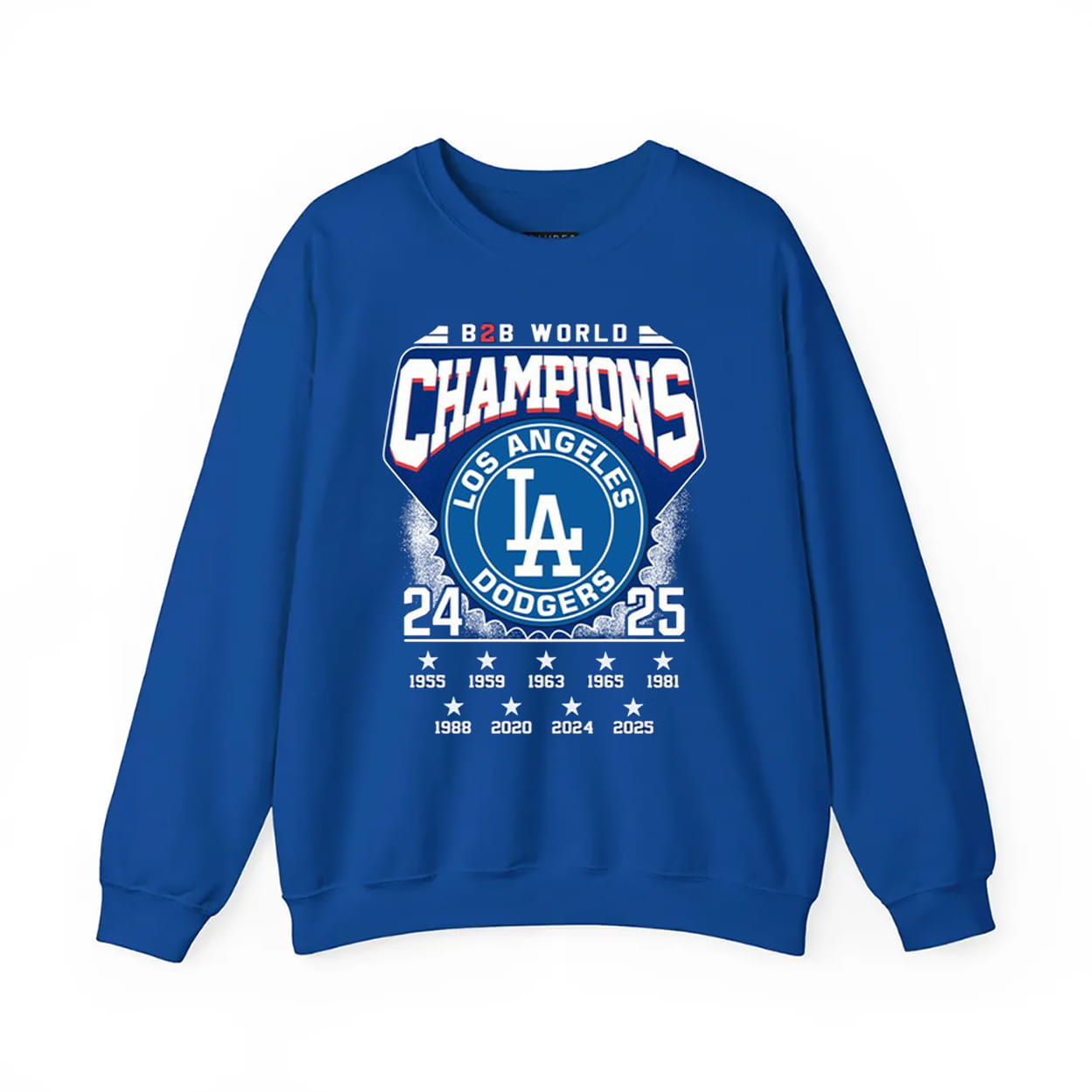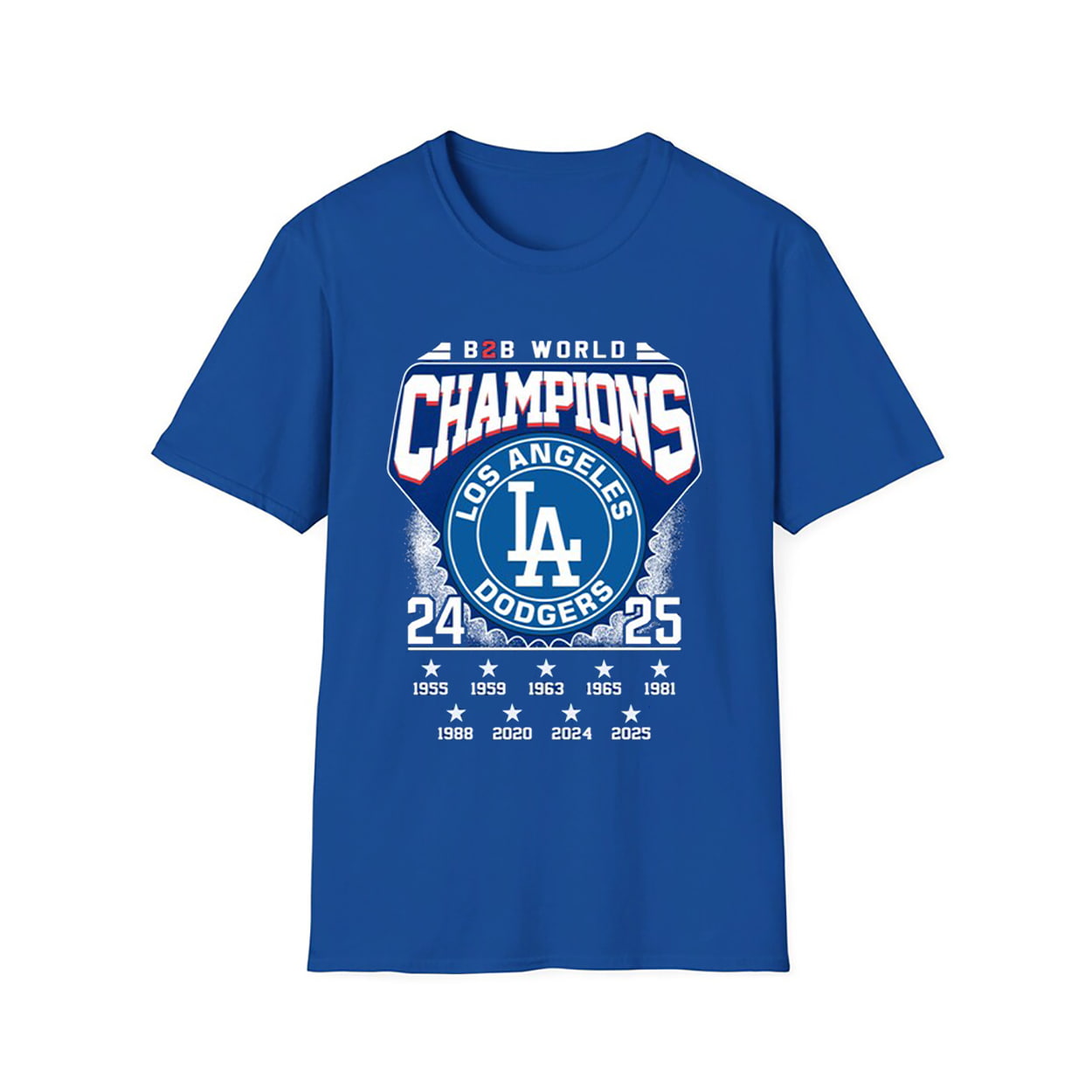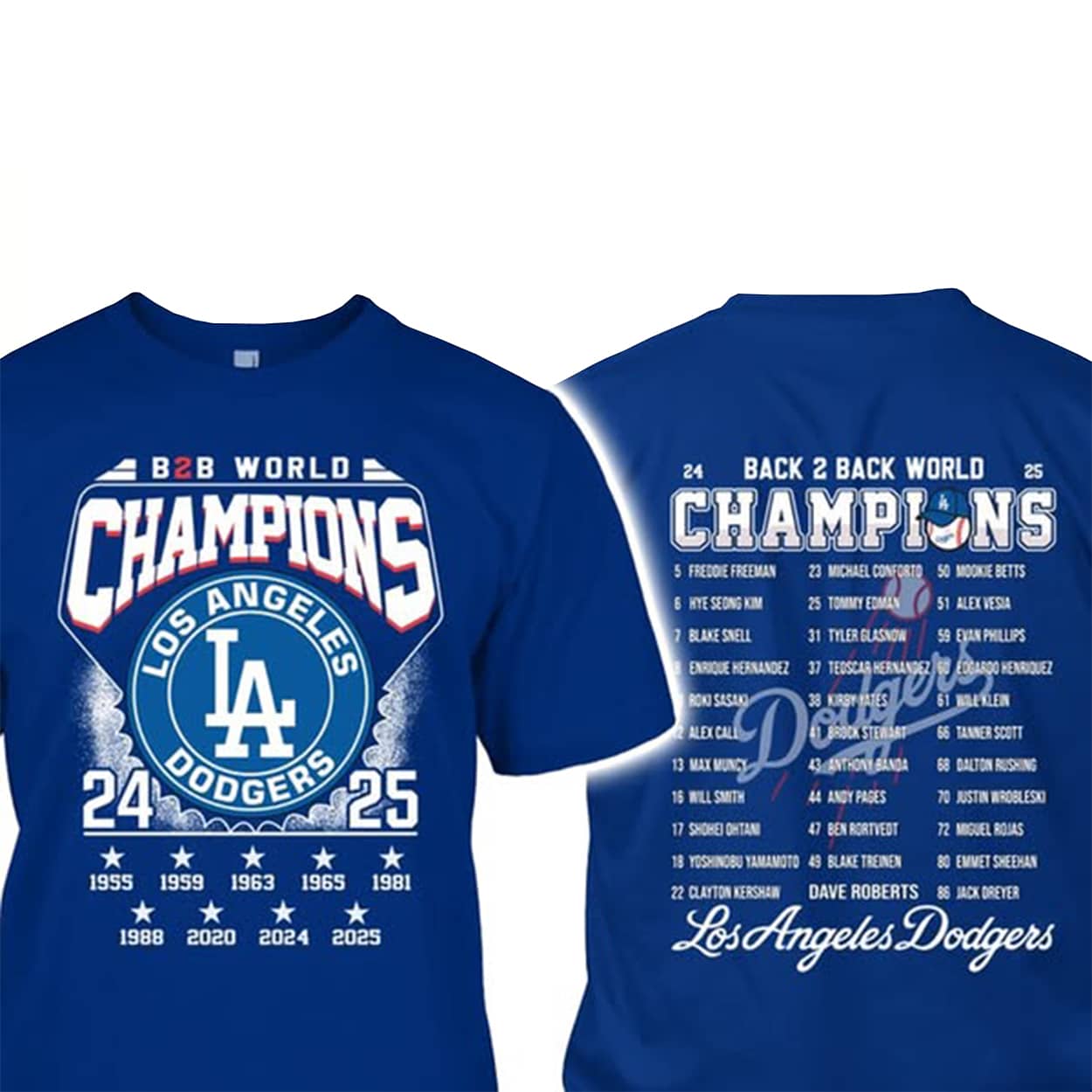 Celebrate the Los Angeles Dodgers’ historic back-to-back World Series wins with this Dodgers B2B World Series Champions 24 25 Two-Sided Shirt featuring championship years, iconic players, and a design that screams victory.