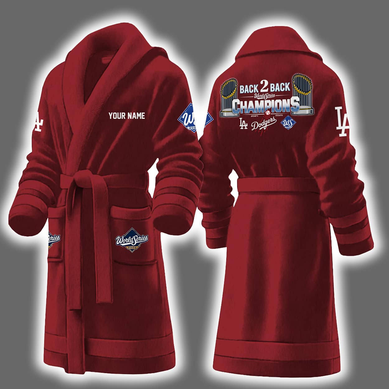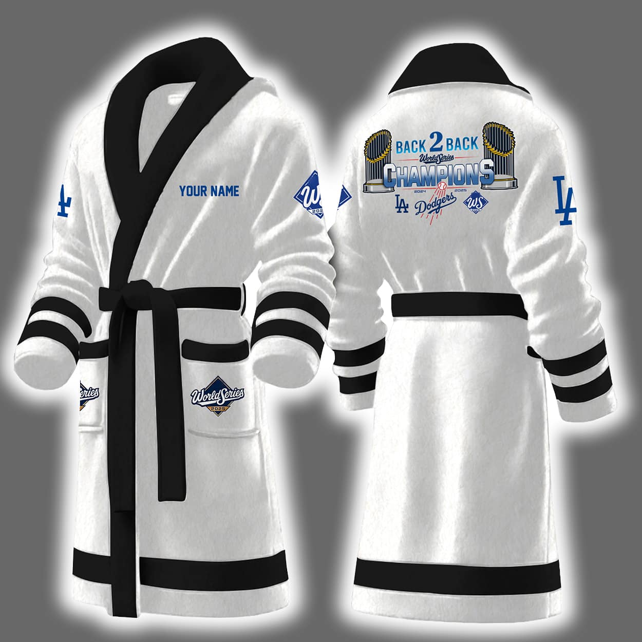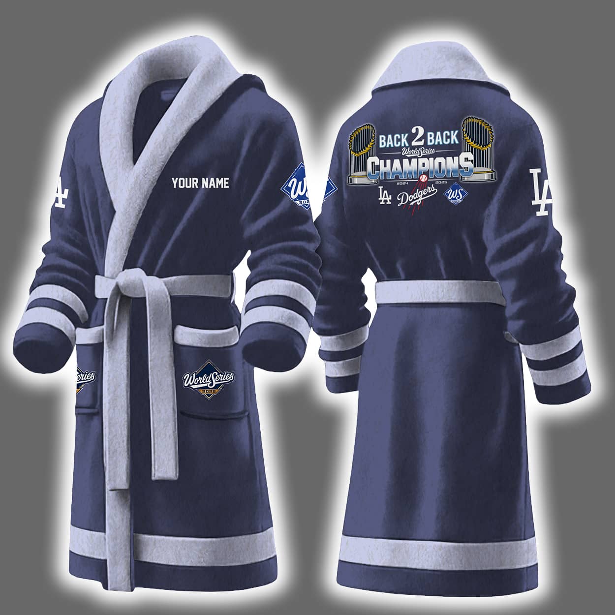 Wrap yourself in pure championship energy with this bathrobe. This robe is a fan’s dream come true, featuring crisp blue and white styling with sporty stripes and a belt that ties it all together. On the front, the left chest proudly displays a customizable “YOUR NAME” tag, while the sleeve rocks the classic “LA” logo. The left pocket adds flair with a “World Series Champions” badge. But the real MVP moment is on the back—bold text reads “BACK 2 BACK CHAMPIONS,” flanked by the years and team logos that mark this historic run.