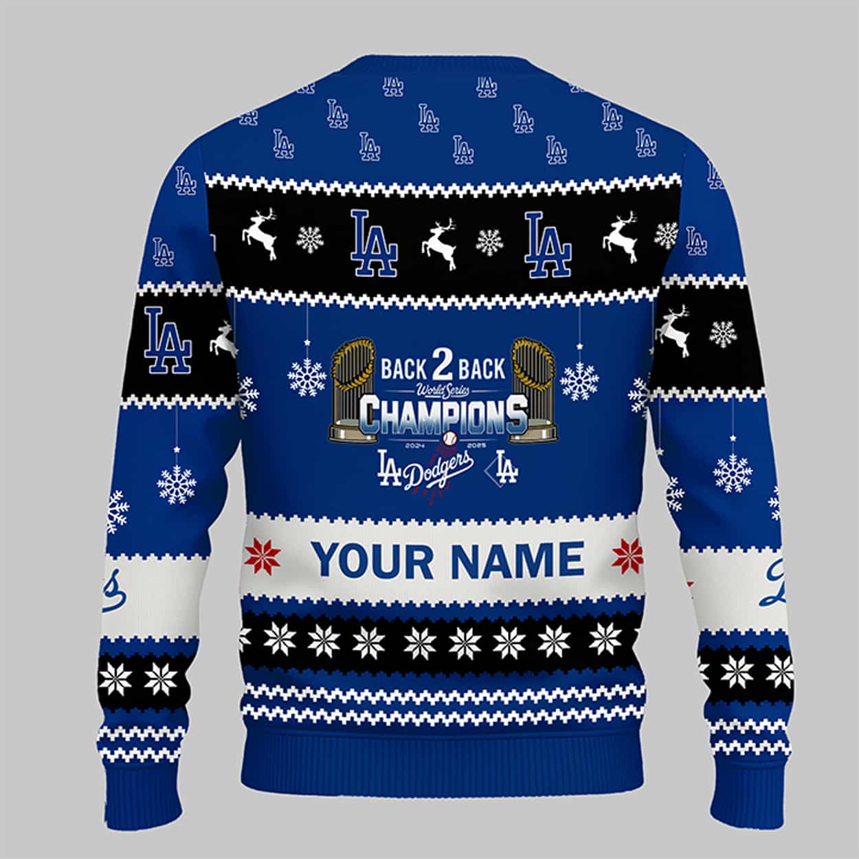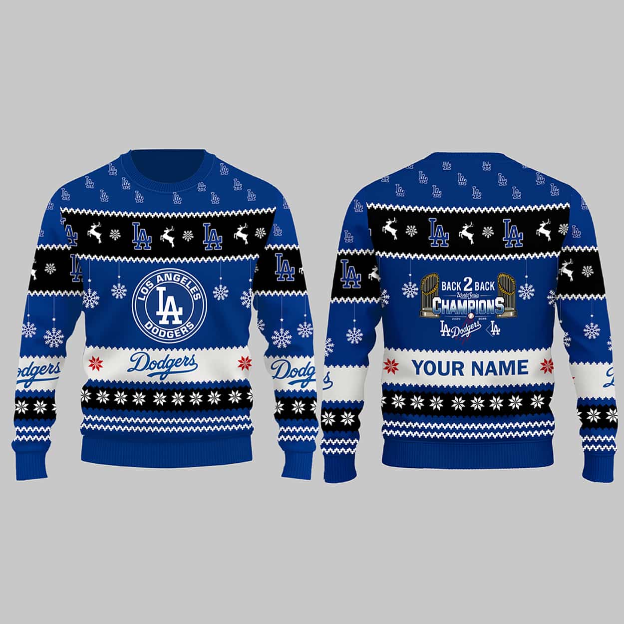 Deck the halls in Dodger blue with this festive and fearless ugly Christmas sweater, designed to honor the team’s epic 2024–2025 World Series victories. The front features a bold circular “LA” logo surrounded by snowflakes and reindeer, blending holiday charm with team pride. “Dodgers” script runs down both sleeves, while the sweater’s pattern dances with wintry icons in blue, black, and white. Flip it around and you’ll find the real celebration: two golden trophies, the years “2024” and “2025,” and the triumphant phrase “BACK 2 BACK CHAMPIONS” front and center. Plus, there’s a customizable “YOUR NAME” section—because legends deserve recognition.
