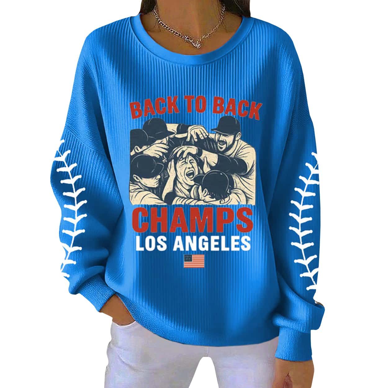 Celebrate the Dodgers’ epic repeat victory with the Dodgers Back To Back Champs Print Ribbed Sweatshirt—where bold design meets championship swagger.