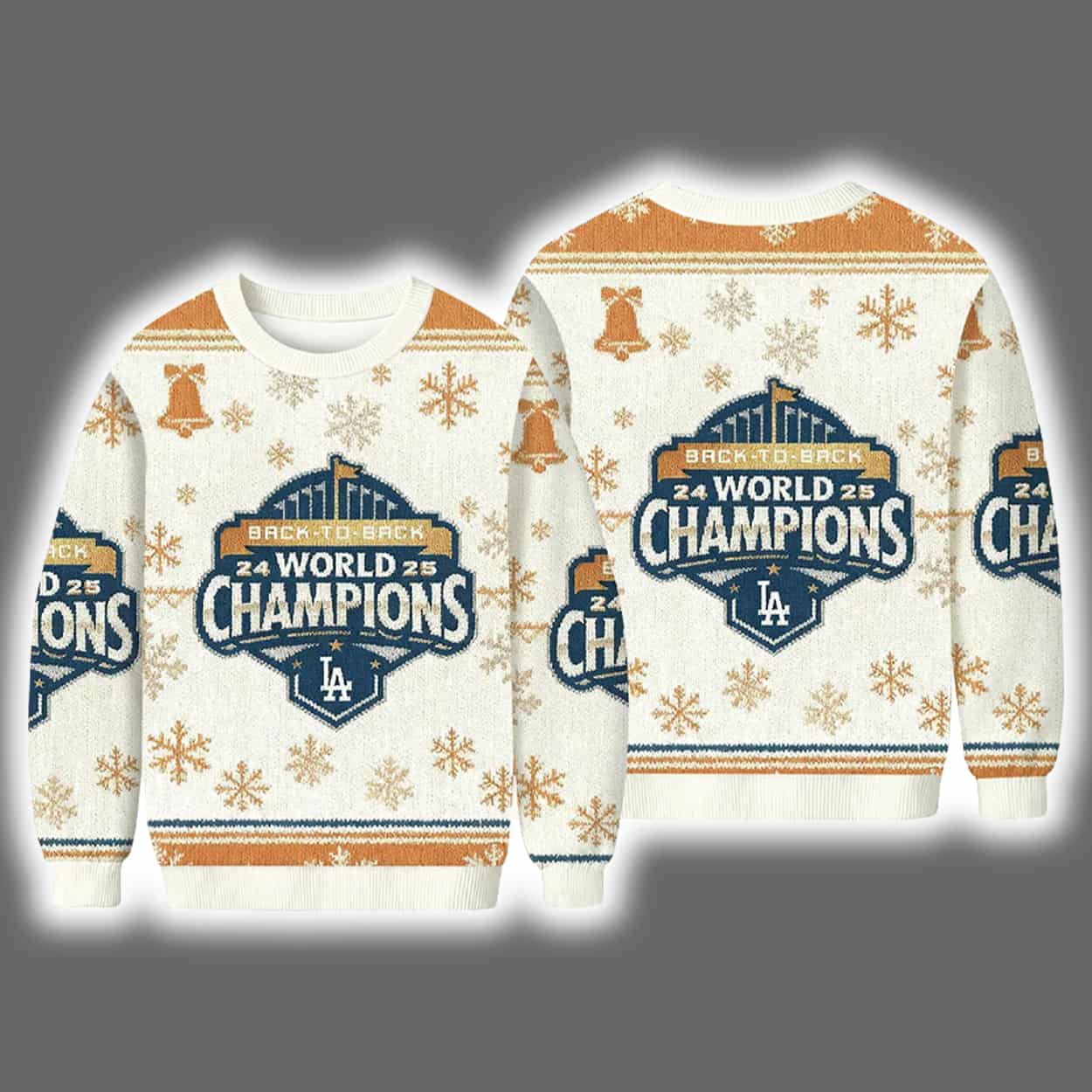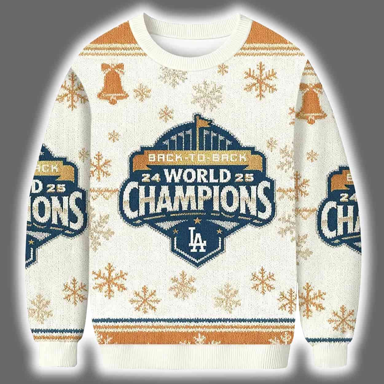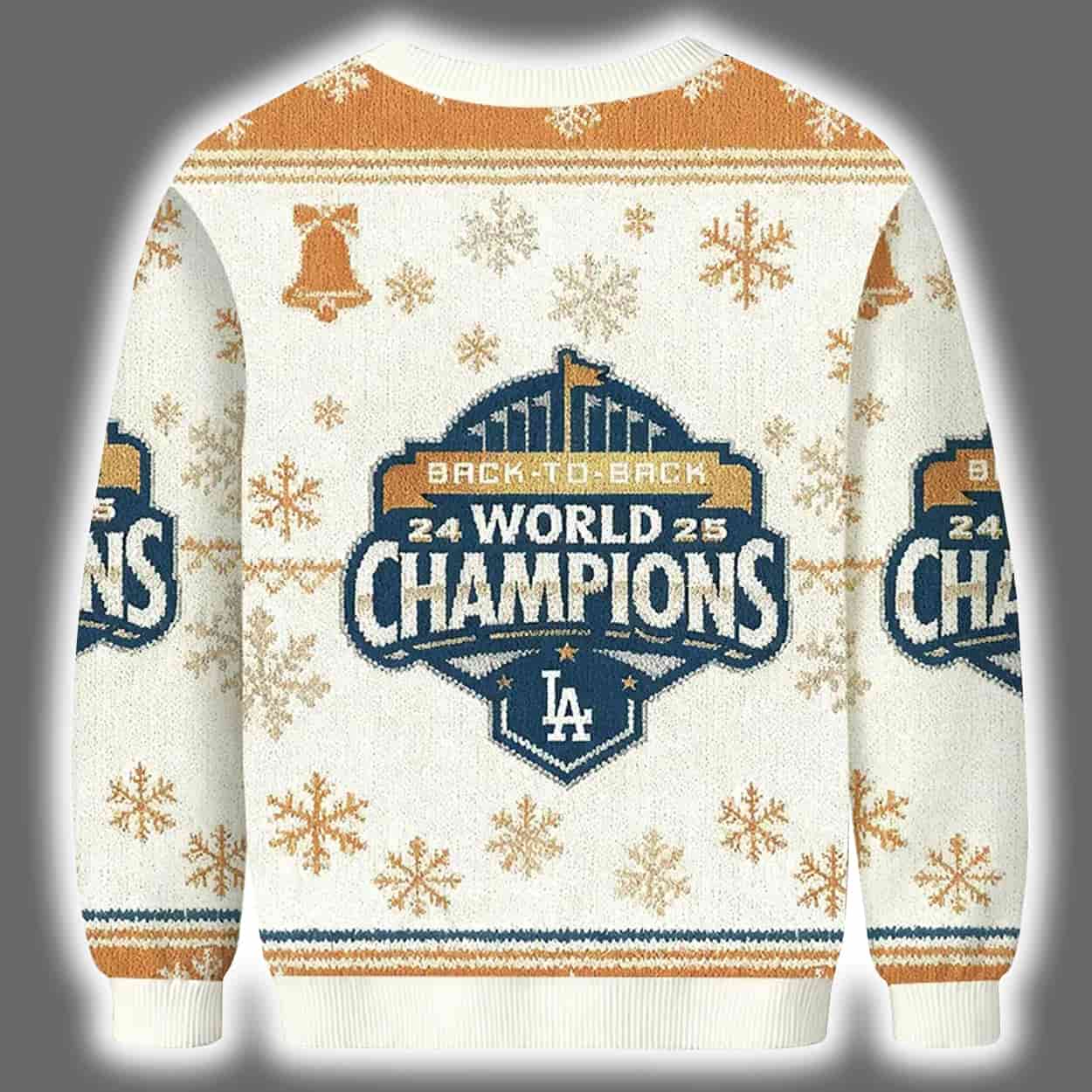 Step into the holiday season with swagger and team pride in this sweater. This eye-catching piece blends classic Christmas charm with bold sports celebration. Adorned in white, gold, and blue, the sweater features a central emblem that reads “24 WORLD CHAMPIONS 25,” crowned by the triumphant phrase “BACK TO BACK.” The iconic LA logo anchors the design, while golden snowflakes, bells, and festive flourishes dance across the fabric, making it a true winter wonderland for baseball lovers.