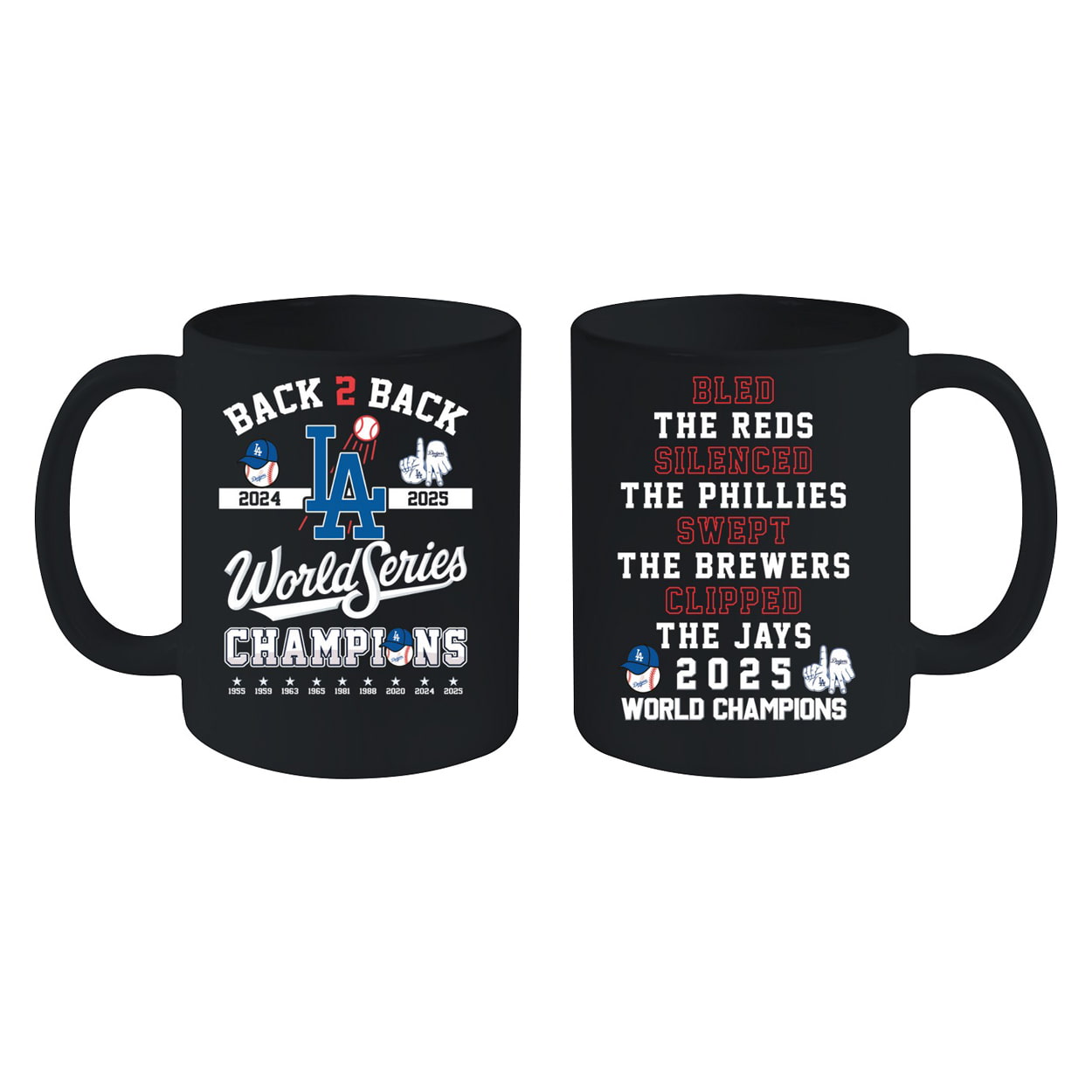 Start your day with a splash of championship energy! This mug is a tribute to the Los Angeles Dodgers’ historic 2024 and 2025 World Series triumphs. On the front, bold white and red text declares “BACK 2 BACK” with the years 2024 and 2025 flanking the proud LA logo. Beneath it, “World Series Champions” seals the deal in celebratory script. Flip it around and you’ll find a cheeky rundown of the teams the Dodgers steamrolled on their way to glory—“Killed the Reds,” “Swept the Brewers,” “Clapped the Jays”—each phrase dripping with playful dominance. It’s not just a mug; it’s a scoreboard in ceramic form.