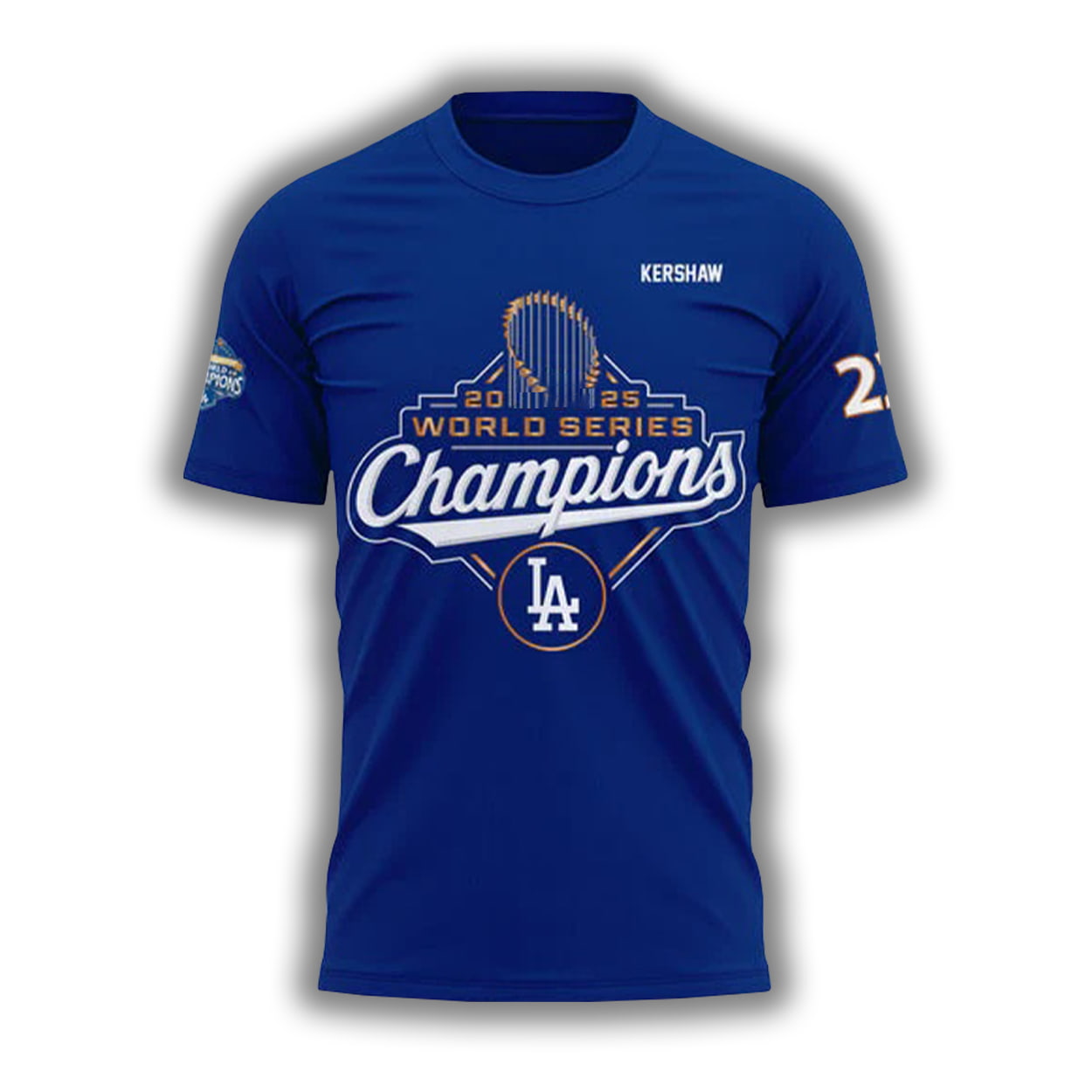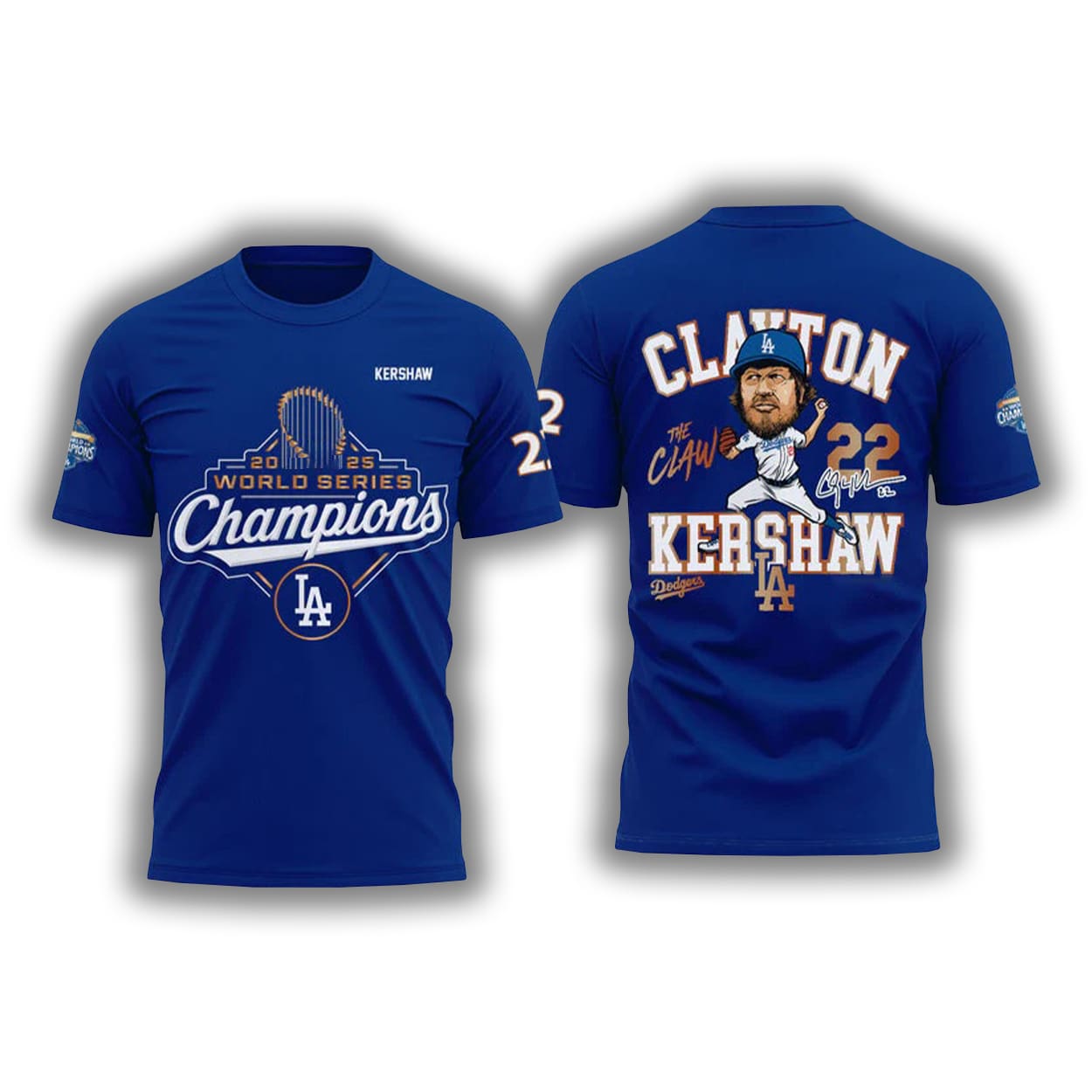 This shirt isn’t just Dodgers merch—it’s a wearable tribute to greatness. On the front, “WORLD SERIES Champions” blazes across the chest, crowned with a stylized trophy that screams victory. The classic LA logo anchors the design, while the number “22” on the sleeve nods to the legend himself. Flip it over and you’re greeted by a dynamic image of Clayton Kershaw mid-pitch, frozen in a moment of pure dominance. His name “CLAYTON” sits proudly above, while “KERSHAW” and “22” command attention below. Scripted accents and the Dodgers logo round out the back, making this shirt a full-circle celebration of a baseball icon.