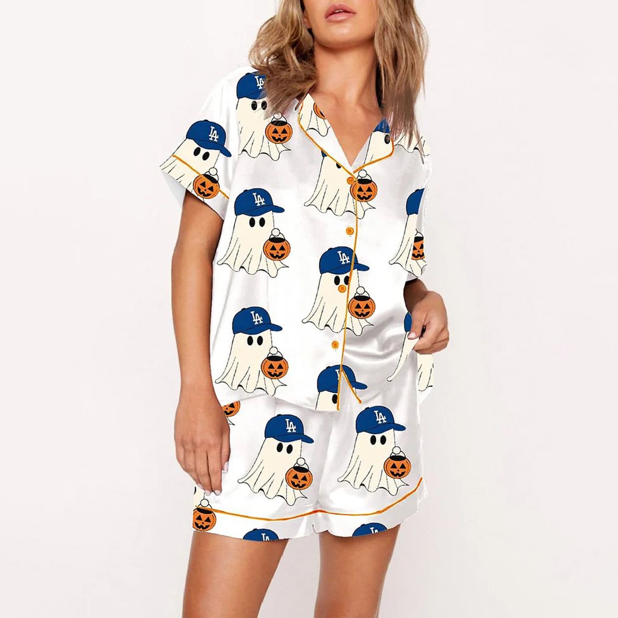 Celebrate spooky season with sporty flair in the Dodgers Ghost Halloween Baseball Pajama Set—where playful ghosts meet LA pride in a delightfully eerie ensemble.