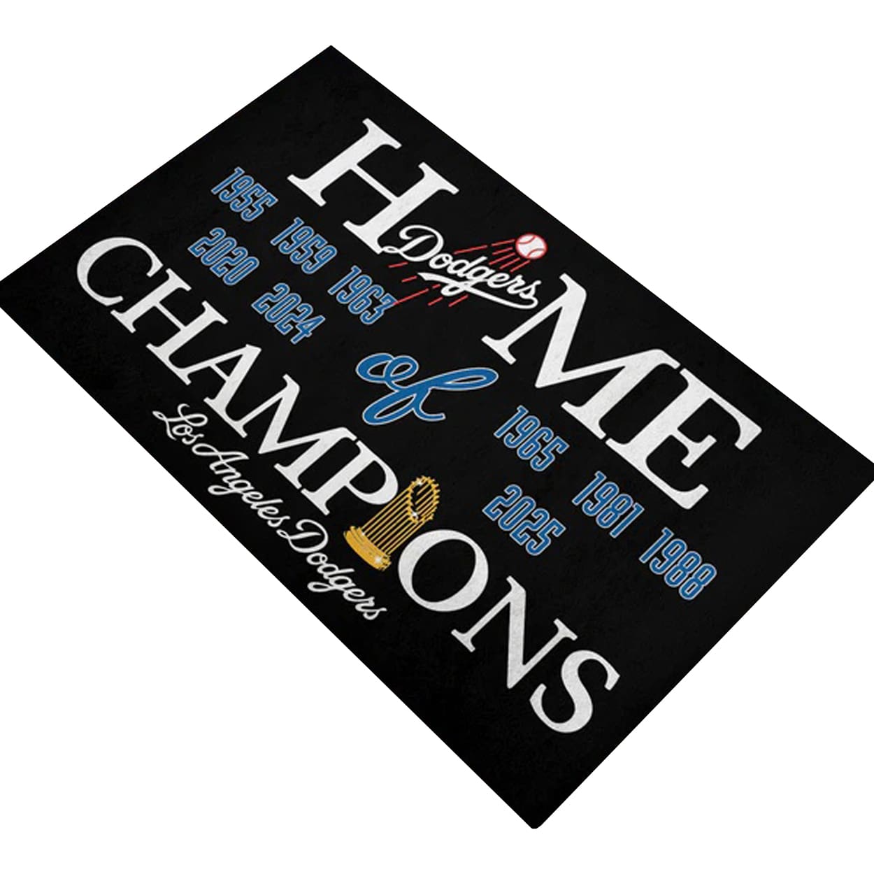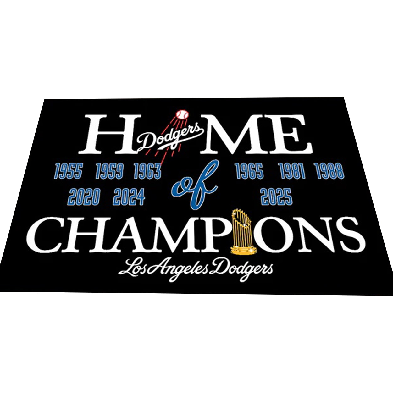 Make every entrance a grand slam with this doormat. Set against a sleek black backdrop, this design pops with bold white, blue, and gold text that proudly declares: “HOME of CHAMPIONS.” The word “Dodgers” is playfully woven into “HOME,” with a baseball graphic adding flair. Below, nine championship years—1955, 1959, 1963, 1965, 1981, 1988, 2020, 2024, and the latest, 2025—are lined up like a hall of fame. It’s not just a doormat—it’s a declaration that greatness lives here.