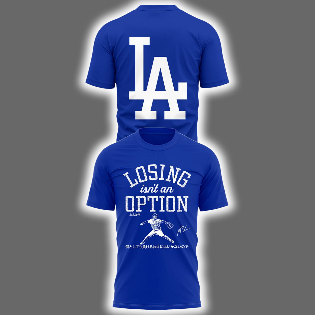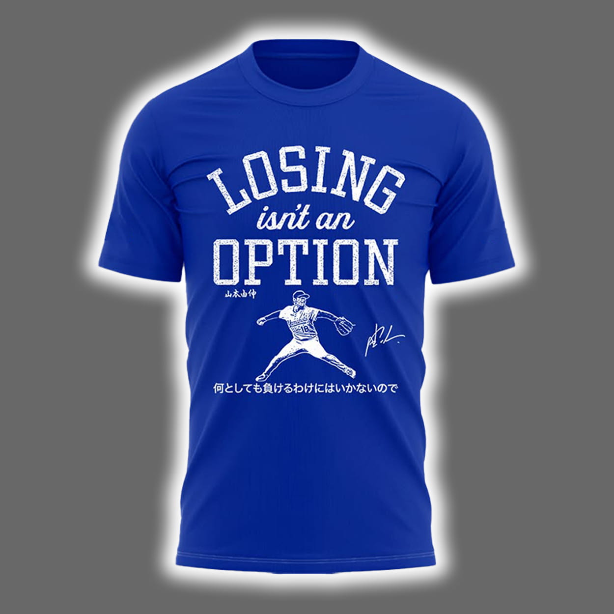 This isn’t just a shirt—it’s a declaration. This shirt delivers impact from every angle. On the front, the slogan “LOSING isn’t an OPTION” is splashed across the chest in bold white lettering, with a dynamic illustration of a baseball player mid-pitch below it. Japanese characters and a signature add a layer of intrigue, hinting at international flair and player influence. Flip it around and you’ll find the unmistakable “LA” logo dominating the back, a proud symbol of the team’s legacy. The deep blue canvas makes every graphic pop, turning heads whether you’re in the stands or on the street.