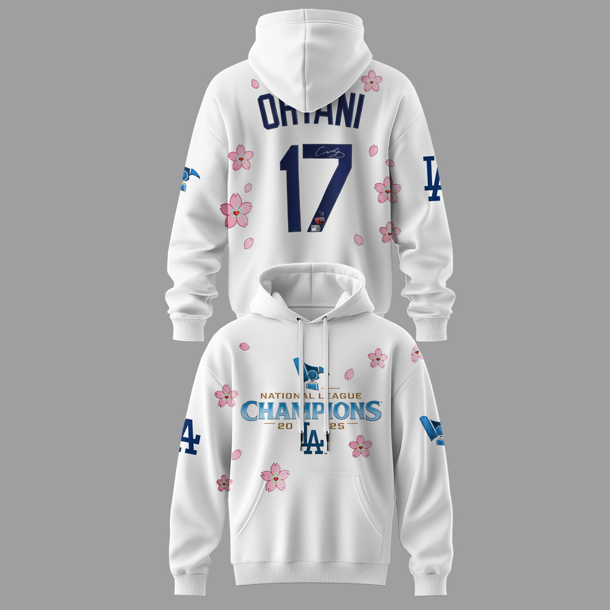 Step into the spotlight with this hoodie—a wearable tribute to baseball brilliance and artistic swagger. The front bursts with “NATIONAL LEAGUE CHAMPIONS 2023” in bold blue and gold, anchored by the Dodgers logo and framed by delicate cherry blossom graphics. Flip it around, and you’ll find “OHTANI” and the number “17” in striking blue, surrounded by a flurry of pink blossoms that add a dreamy, celebratory vibe. Blue sleeve details, including the iconic “LA” and a stylized bird, round out the look with extra flair.