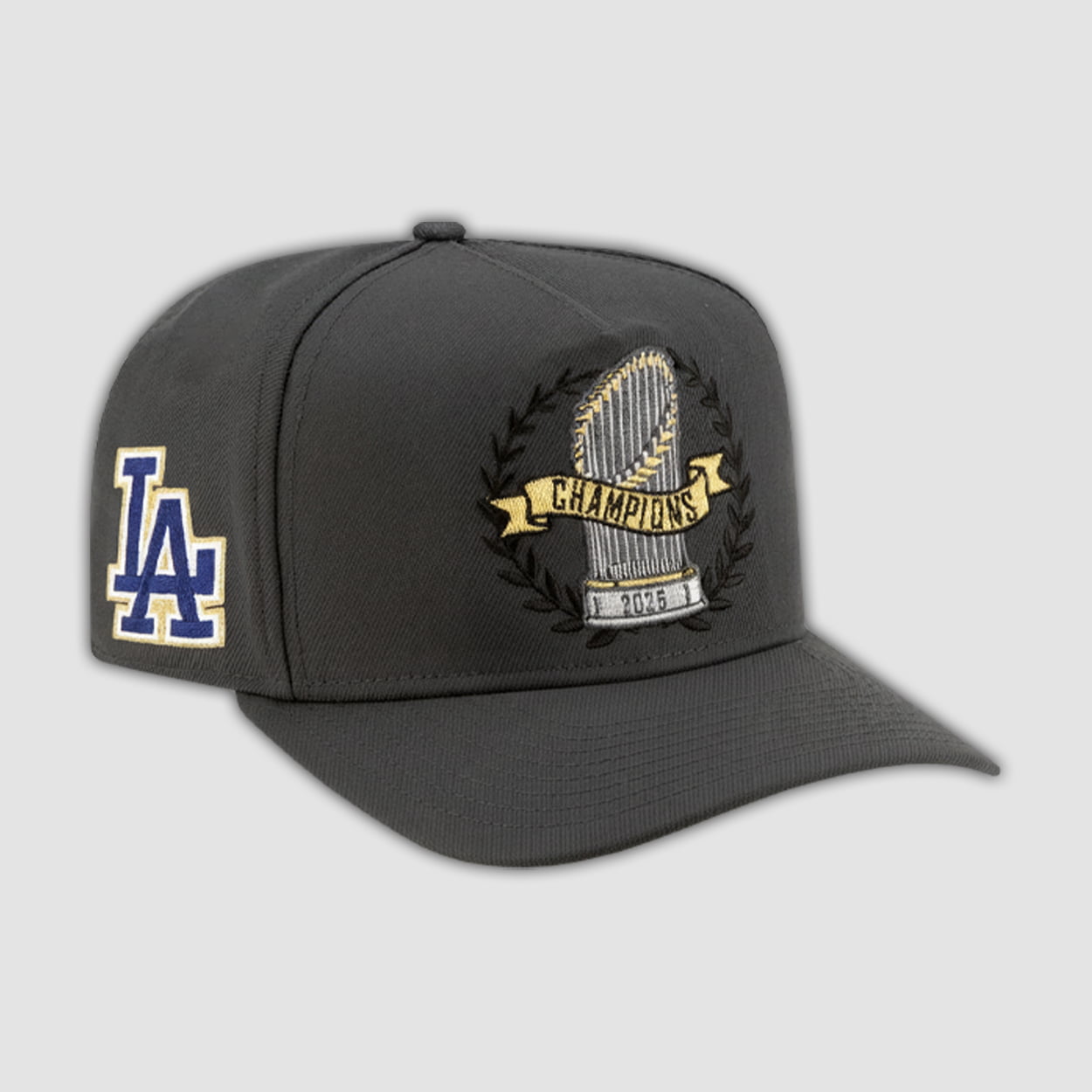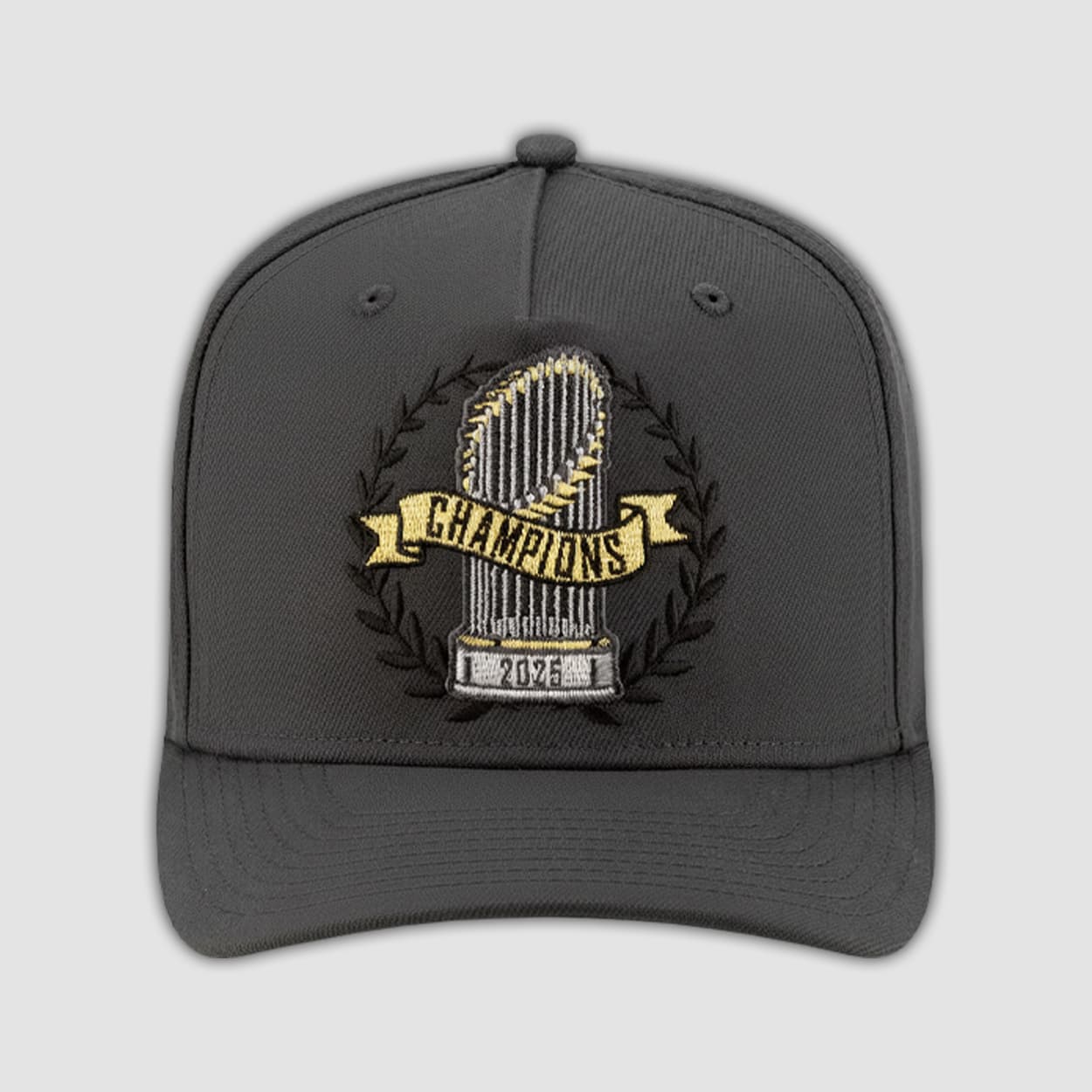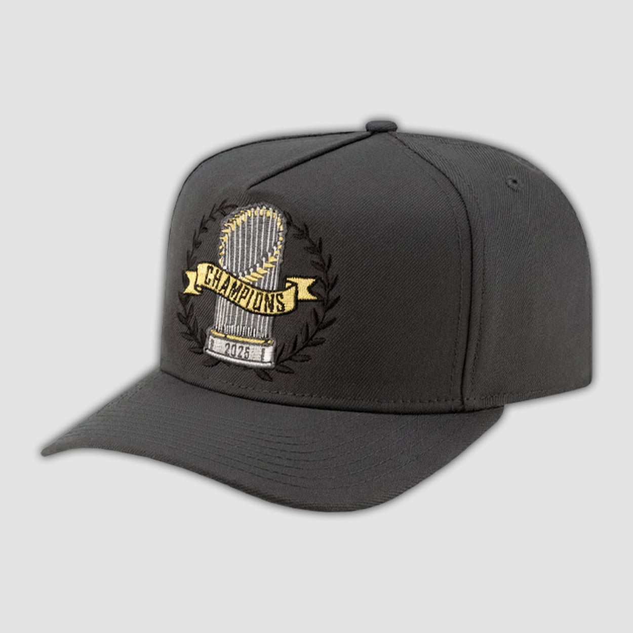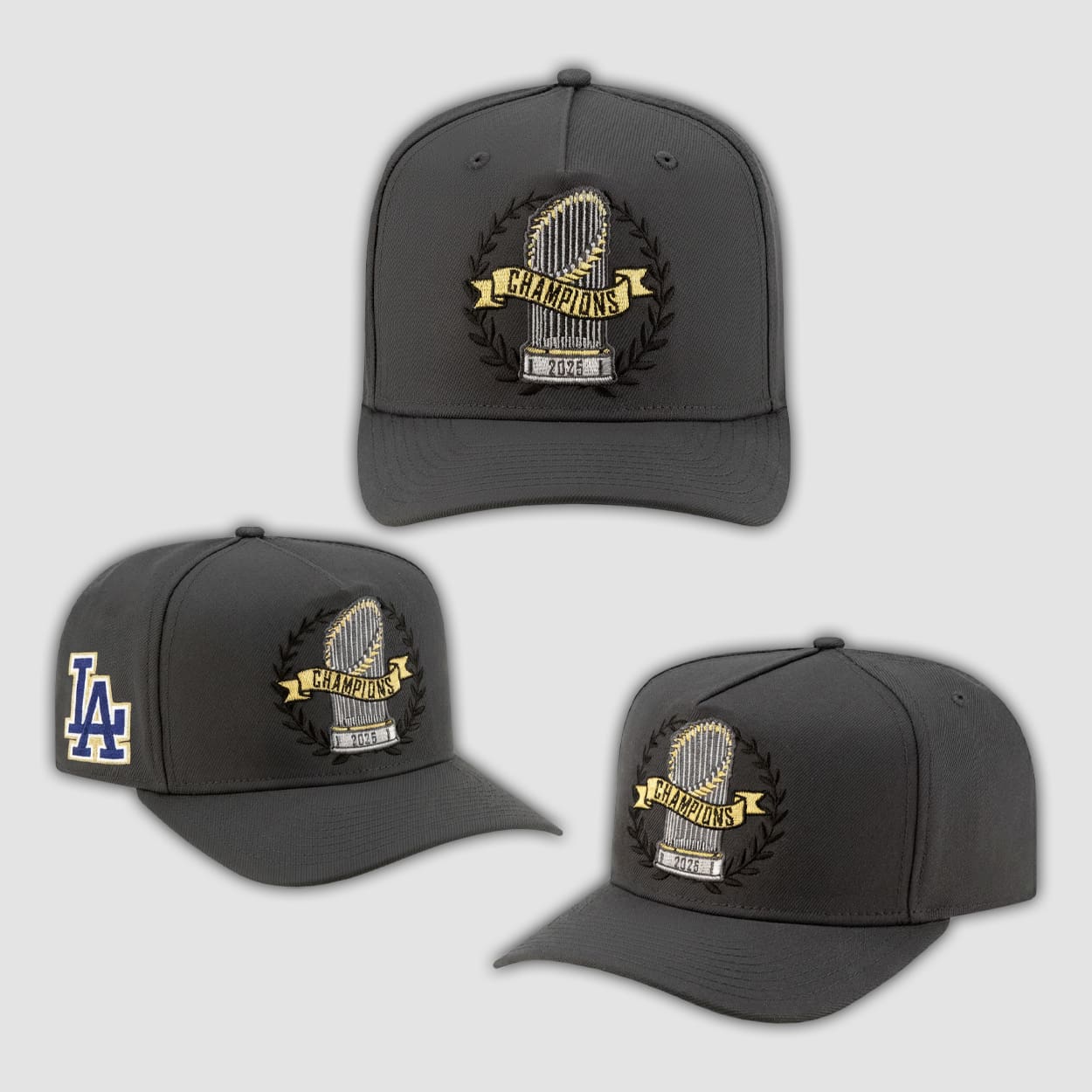 Step into the winner’s circle with this hat—a head-turning tribute to baseball greatness. Front and center, a gleaming championship trophy is embroidered in stunning detail, wrapped in a laurel wreath that screams victory. Above it, a golden banner proudly declares “CHAMPIONS,” while the year “2025” sits below like a badge of honor. On the side, the iconic “LA” logo adds a hometown touch, making it clear who reigns supreme. Whether you’re at the parade or reliving the moment from your couch, this hat brings the celebration to you.