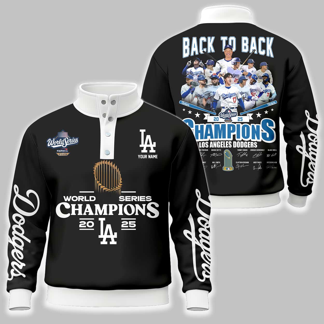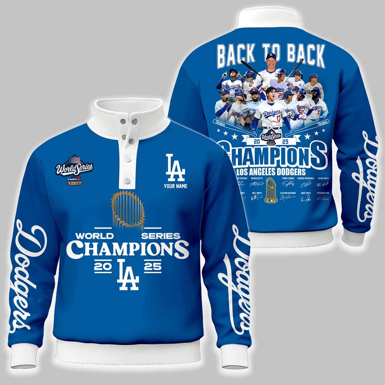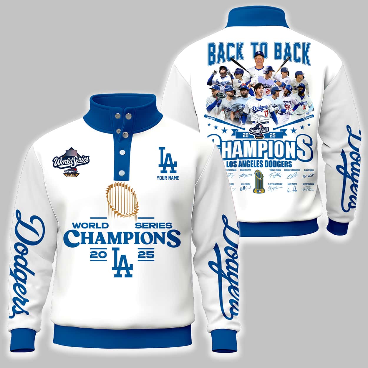 Celebrate a Dodgers dynasty with this 2025 “Back to Back” World Series Champions Snap Sweater. This unique pullover, available in Dodger blue, black, and white, features a stylish high collar with a quarter-snap placket. The front is a complete tribute to the victory, showcasing the “WORLD SERIES CHAMPIONS” title, the “LA” logo, the Commissioner’s Trophy silhouette, and the 2025 World Series patch. It also features a “YOUR NAME” customization option, with “Dodgers” running proudly down both sleeves.