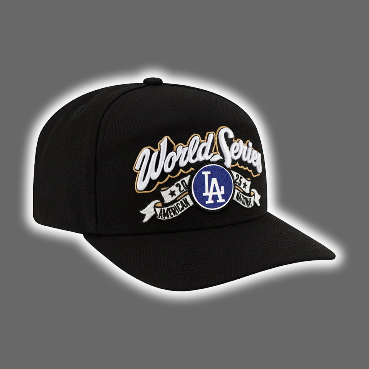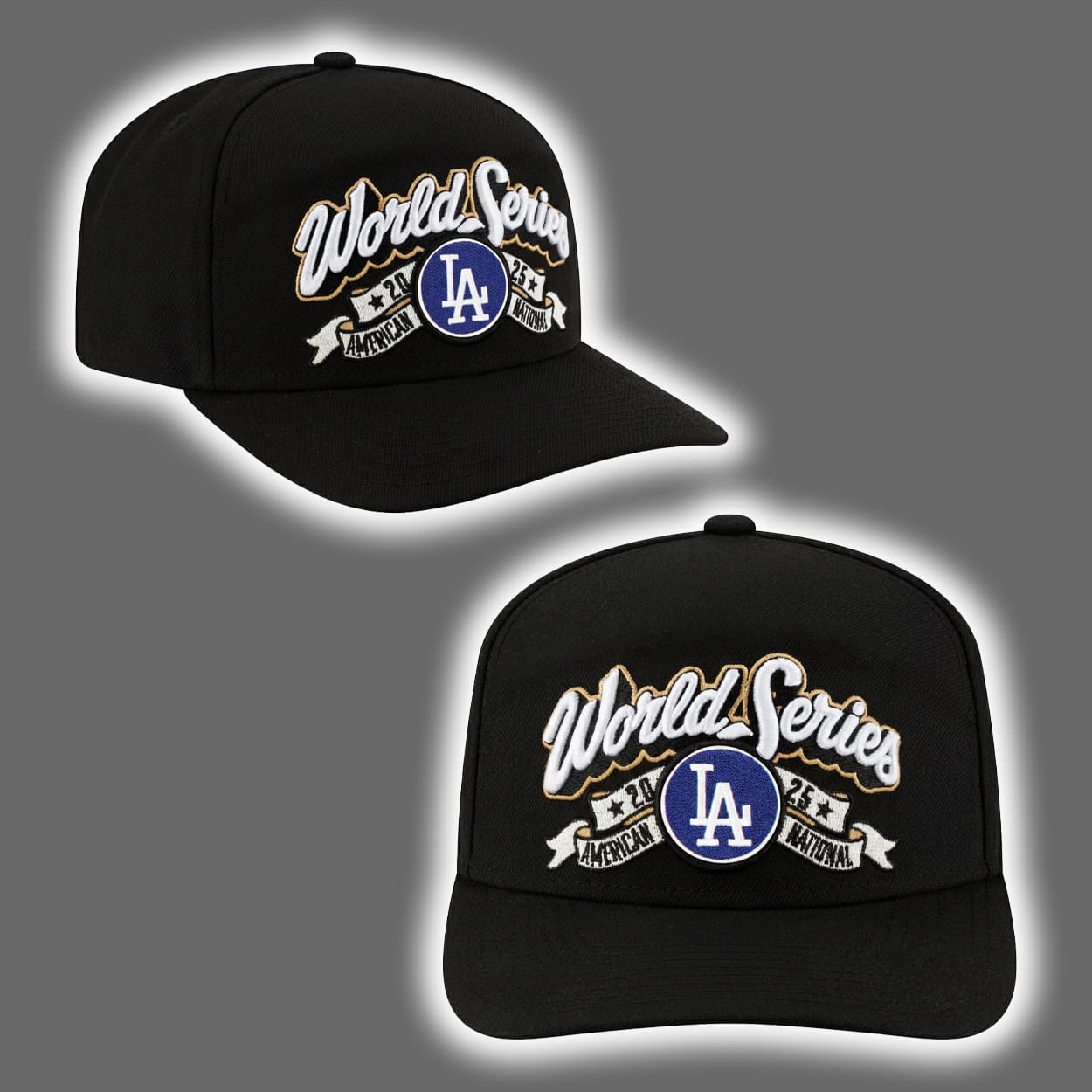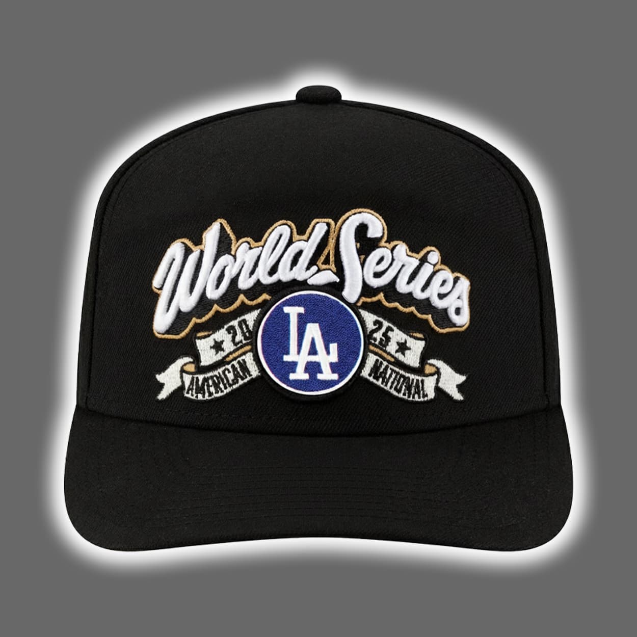 Step into the spotlight with this hat—a tribute to victory, legacy, and unapologetic team pride. This sleek black cap showcases the words “World Series” in a stylized white and gold font, boldly embroidered across the front like a trophy etched in thread. Beneath it sits the unmistakable blue circular emblem with crisp white “LA” lettering, a nod to the heart of Los Angeles baseball. Flanking the emblem are two banners—“AMERICAN” on the left and “NATIONAL” on the right—symbolizing the unity of leagues and the dominance of a team that conquered them both.