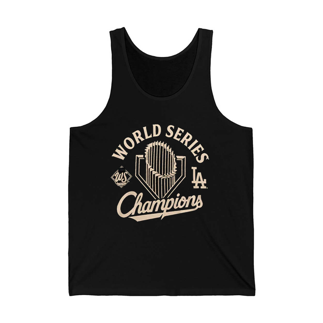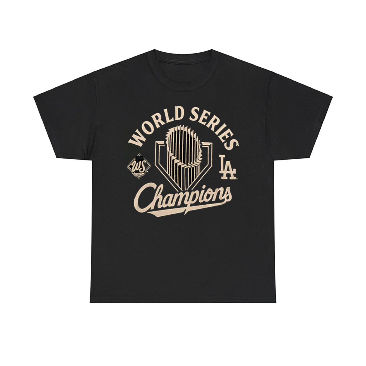 Step into victory with this shirt—a wearable tribute to baseball greatness. This black tee bursts with energy, showcasing a beige-toned graphic that screams celebration. Front and center, the words WORLD SERIES Champions are emblazoned in bold, triumphant lettering. Above it, the iconic Commissioner’s Trophy gleams like a beacon of glory, flanked by the unmistakable LAD logo on the left and a sleek “LA” on the right. It’s not just a shirt—it’s a front-row seat to history.