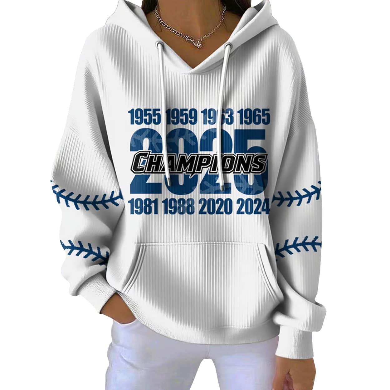 Step into the winner’s circle with this hoodie. The front showcases a lineup of championship years—1955, 1959, 1965, 1973, 1981, 1988, 2020, 2024—culminating in the bold, oversized “2025” stamped in blue, with “CHAMPIONS” emblazoned across it in black and white. It’s a visual mic drop for fans who’ve waited for this moment. The sleeves feature ribbed pit stripes styled like baseball stitching, adding a sporty edge that nods to the game itself.