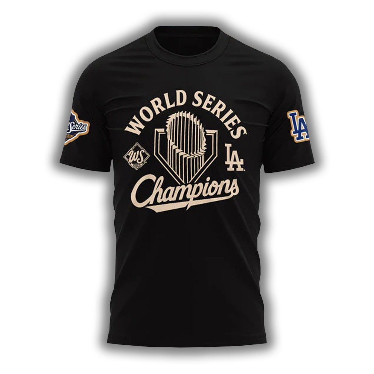 Step into the winner’s circle with this shirt. The front bursts with energy: a gleaming championship trophy takes center stage, flanked by the proud “WORLD SERIES Champions” text and the unmistakable LA logo. A crisp “2025” stamp seals the deal, while the sleeve patch adds that extra parade-day swagger. Flip it around and the back roars with legacy—“WE RULE OCTOBER” in bold caps, followed by “BACK TO BACK WORLD SERIES CHAMPIONS” and the golden years: 2024, and now, 2025.