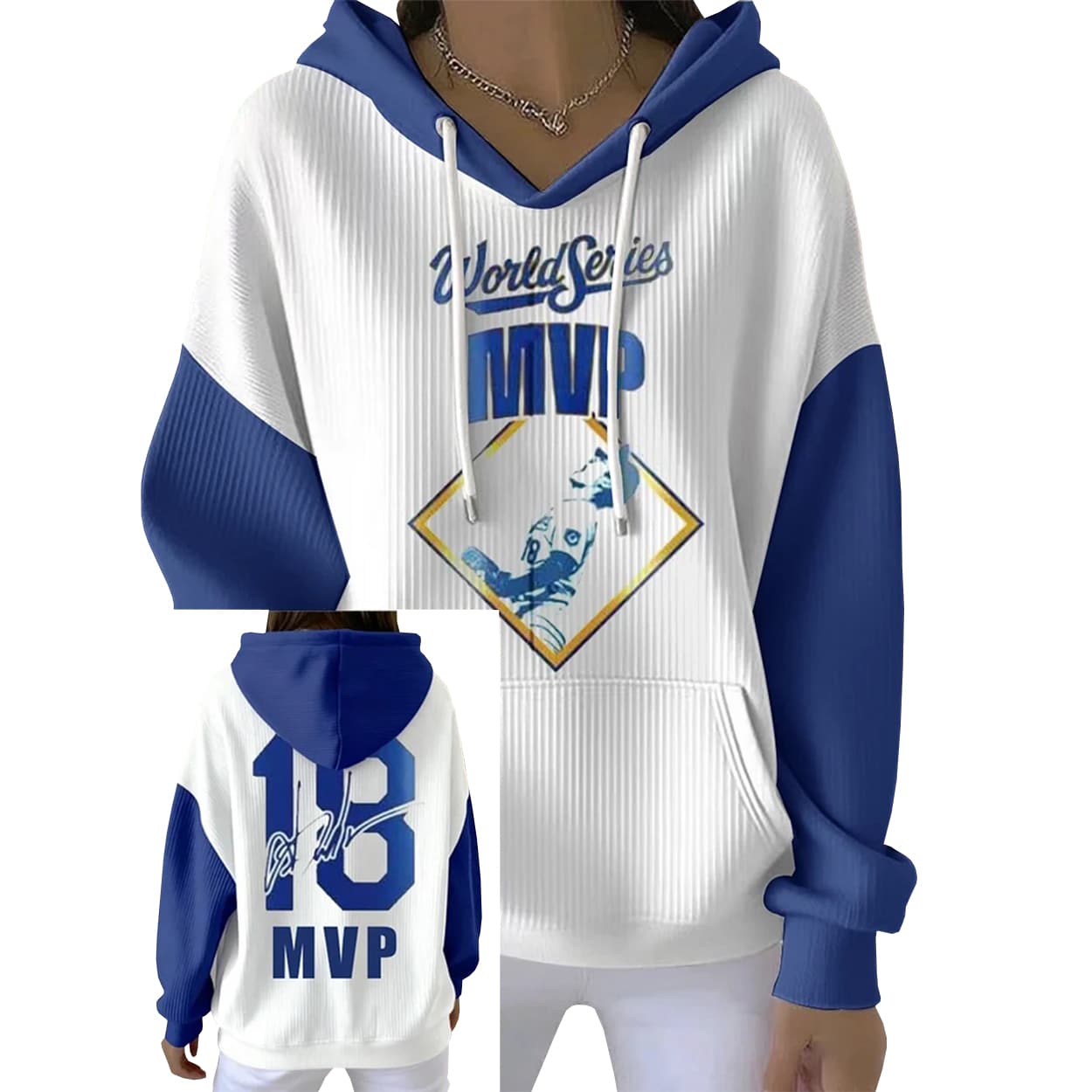 Make room in your wardrobe for a legend. This hoodie is a celebration of clutch performance and iconic style. The front features “World Series MVP” in bold blue lettering, anchored by a dynamic graphic of Yamamoto sliding into base inside a golden diamond—pure action, frozen in time. The hoodie’s crisp white body contrasts with deep blue sleeves and hood, while ribbed texture adds a sporty edge. Flip it around and you’ll find “18” stamped in bold blue on the back, with “MVP” and another action-packed player graphic that screams championship energy.